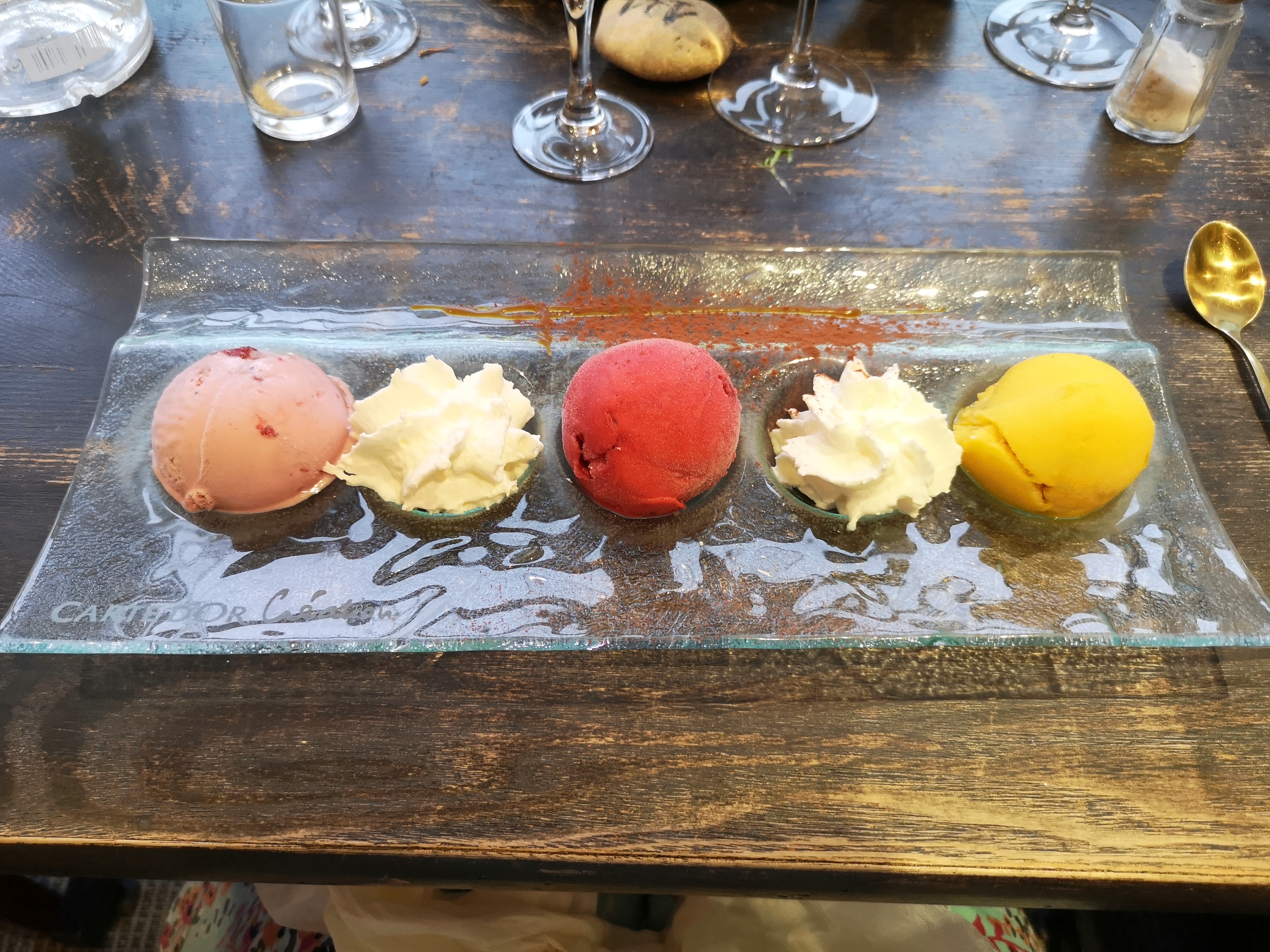 Après avoir découvert ce restaurant une première fois où tout étais bien dans l'ensemble. Nous y sommes retournés et la franchement déçu....brochette tombé dans le poivre.. réponse de la serveuse le cuisinier à la main lourde..... glace remplie de glaçons ....framboise pourrie sur la glace ( photos jointes) et les parfums n'étaient pas ceux commandé....et cette fois-ci trois personnes au service c'est dommage car la quantité du personnel joue sur la qualité.! Et un repas expéditif à regarder sans arrêt si les assiettes etaient vident!!!