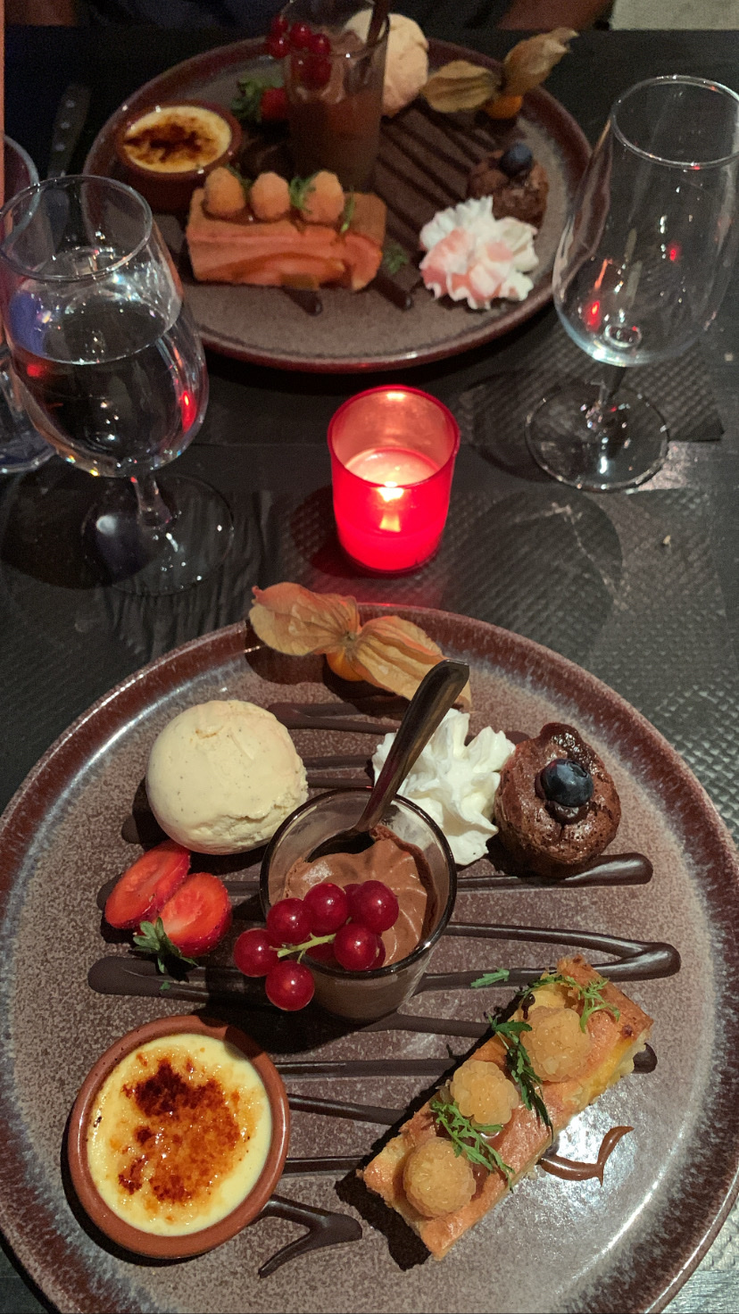 Au menu ce soir Épée de fou Assiette de déserts gourmands Un service impeccable. Des personnes sympathique Le menu un délice Très bon