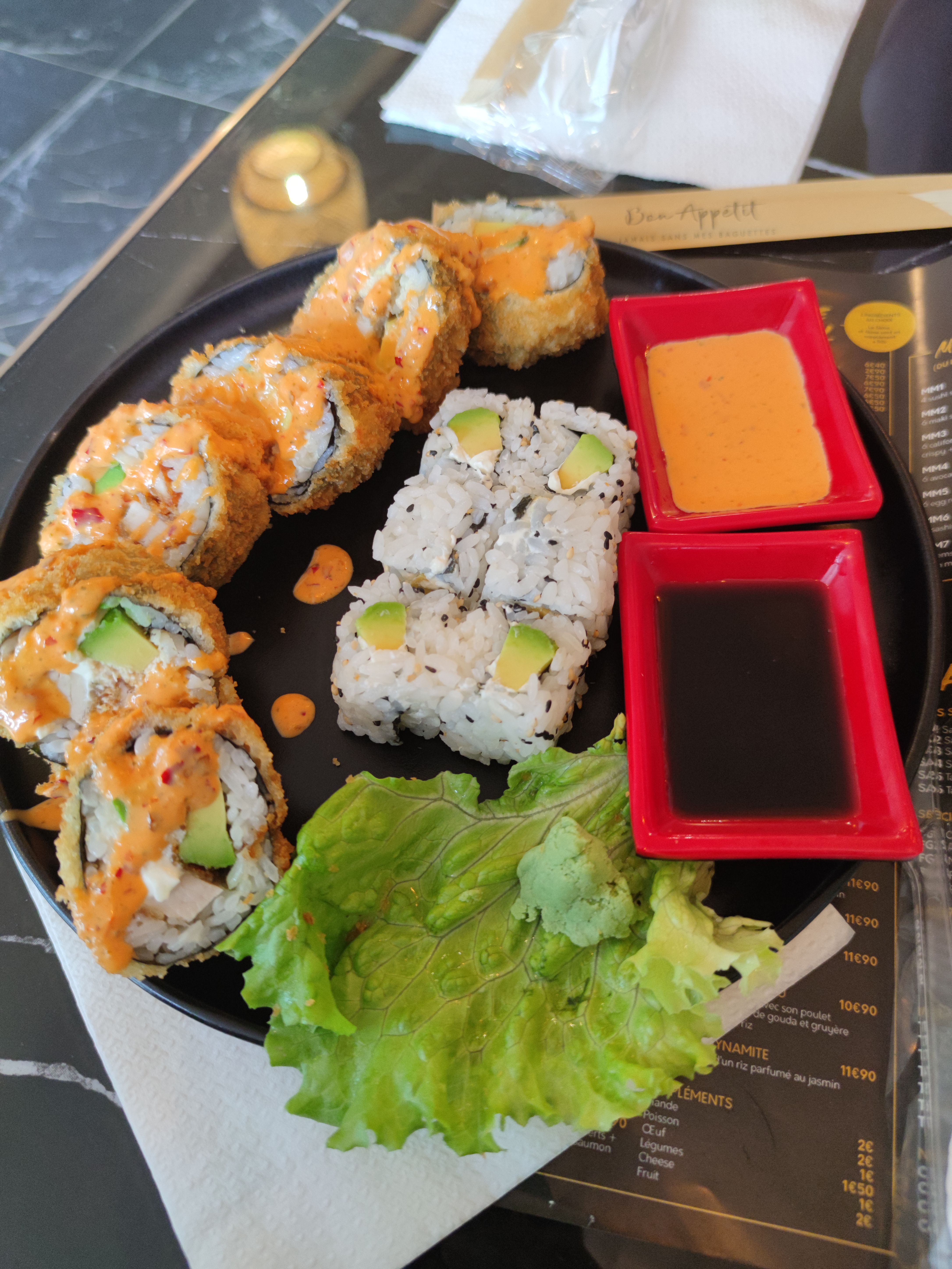 Déjà en arrivant le gérant tout sourire, possibilité de commander via QR code très pratique, service rapide,plat frais sushis exquis,salade avec sa crème cheese une tuerie 🤤on n'adore avec ma fille experte des sushis !!
