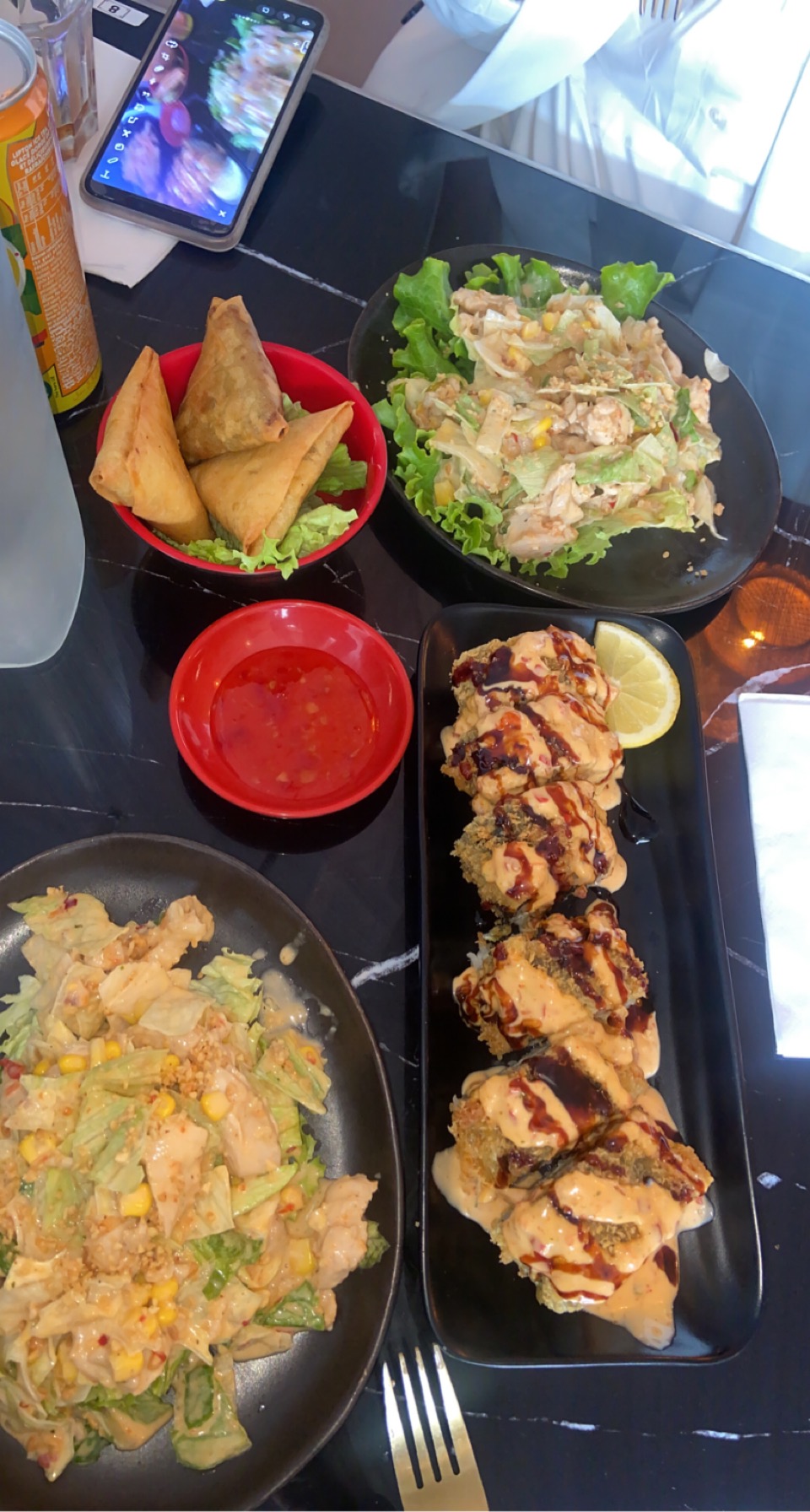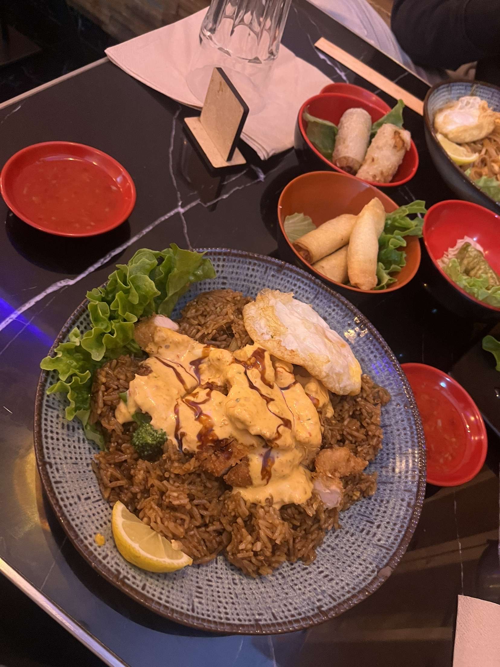 Super resto! Les serveurs sont gentils et souriants, les plats sont copieux et délicieux. Nous avons pris les pad thaï au poulet pané, le riz kao prat aux crevettes, les sumo roll signatures saumon et franchement tout était super bon! Étant une fan de cuisine japonaise et thaïlandaise je recommande vivement ce restaurant ! Une mention spéciale pour les serveurs Mohamed et Sofiane qui étaient aux petits soins pour nous.
