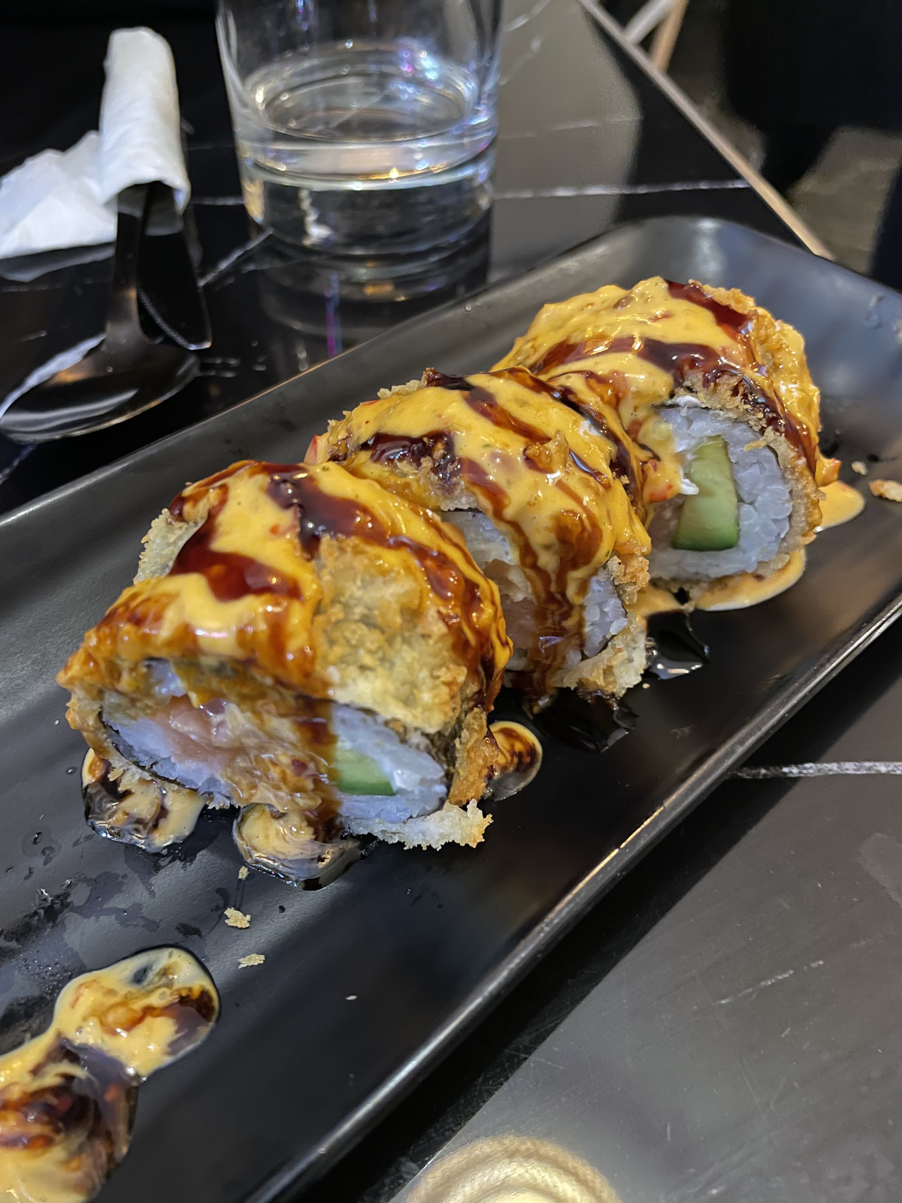J’ai trouvé qu’il y avait beaucoup d’attente malgré tout ils ont eu la gentillesse de nous offrir des boissons de plus les sushis sont vraiment remplis de salade ce que je n’avais jamais vu auparavant, en plus leur poulet pané était dur dans le bao ce qui ne collait pas avec la texture du pain, pour finir les sushis classique ont beaucoup trop de riz et sont petits par rapport au prix payé sinon les desserts sont pas mal