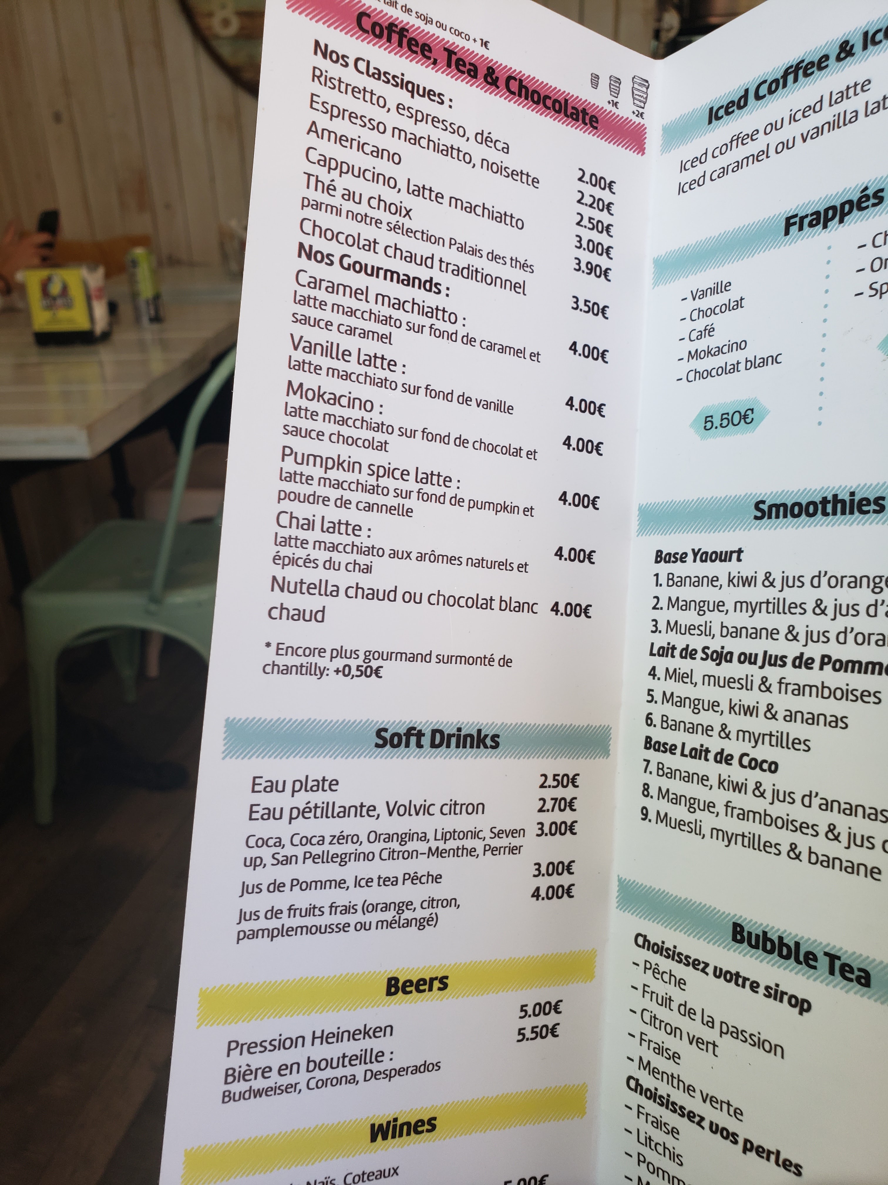 enlevez les bubble tea de la carte .... franchement payer 5 euros pour de l'eau avec du sirop et une tonne de glaçons ! non merci dans la dénomination bubble tea il y a le mot THE, chose que nous n'avons pas trouvé
