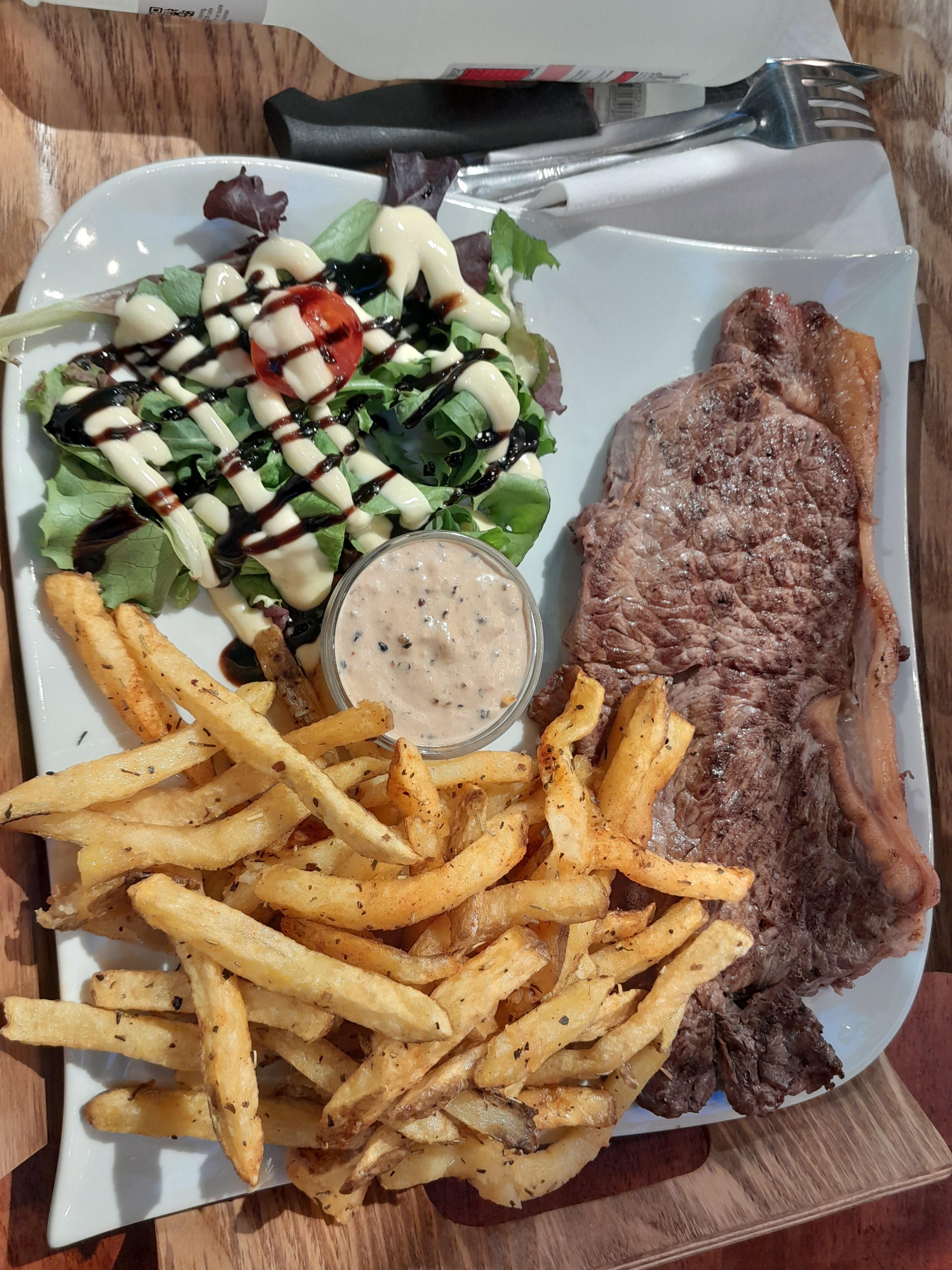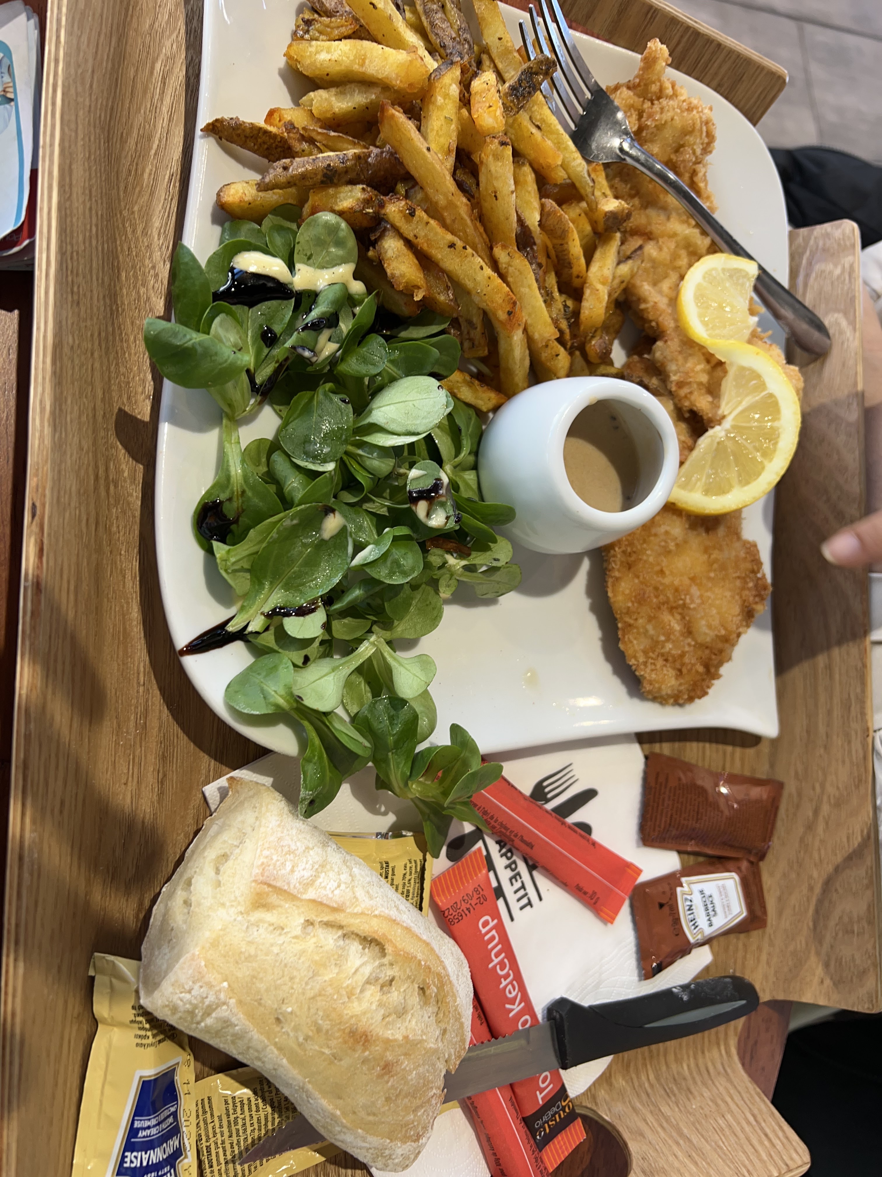 J'ai pris des pâtes carbonara qui étaient assez fade, j'ai du rajouter 2 sachets de sel et de poivre. J'ai gouté l'escalope gratinée où le goût de la crème fraîche était trop prononcé à mon goût. Frites avec cheddar pas mal.