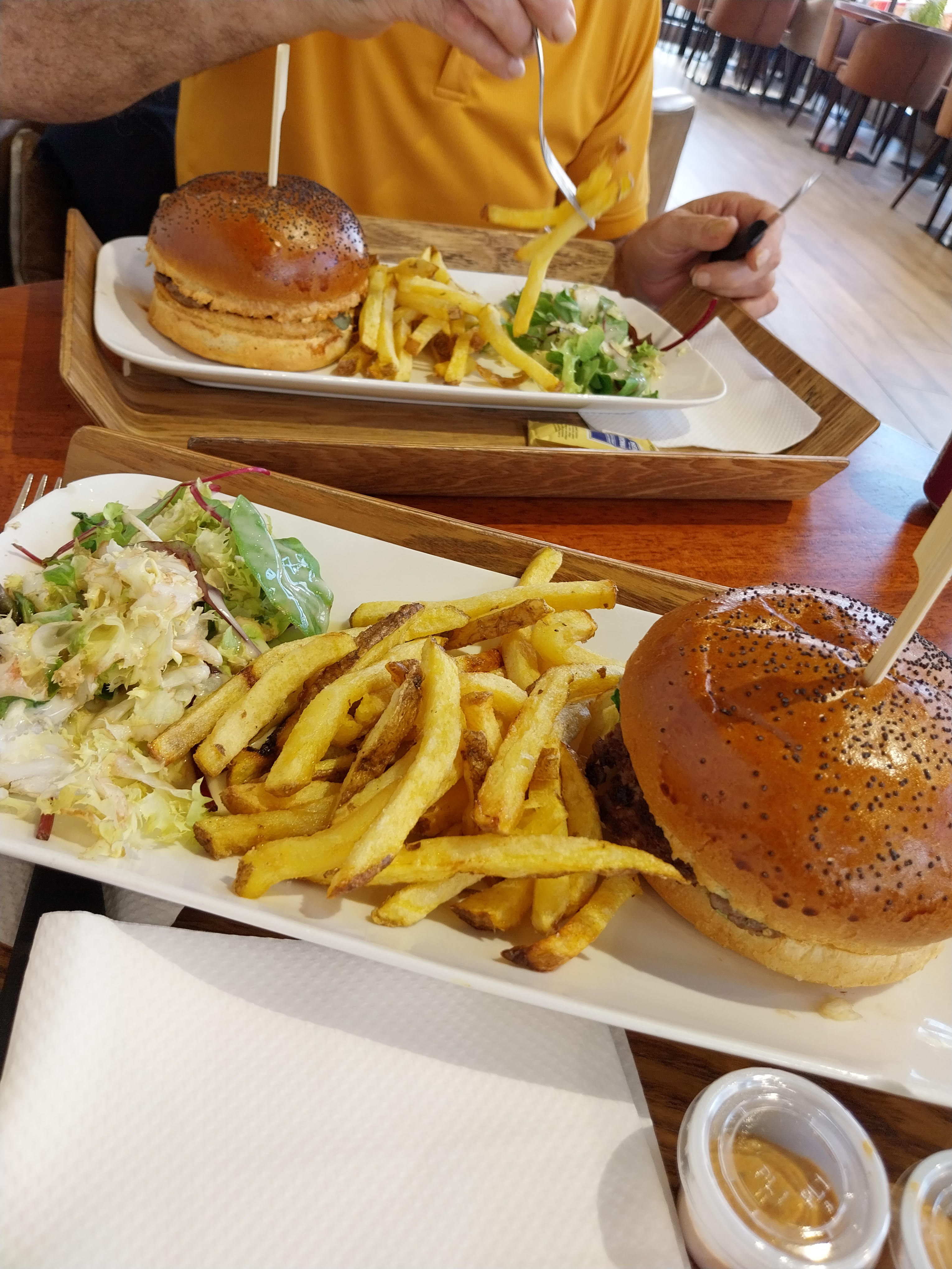 Plats très copieux. Nous étions une tablée de 15 personnes pour un anniversaire du coup on a eu droit exceptionnellement au service à table . C-à-d que nos plateaux individuels nous ont été apportés directement en salle. Alors que d'ordinaire on nous donne un boitier électronique qui vibre quand notre commande est prête et on retirer nos plateaux en caisse. Ambiance plutôt sympa même s'il y avait un certain brouhaha. Mais bon plutôt logique pour un samedi soir, non ?