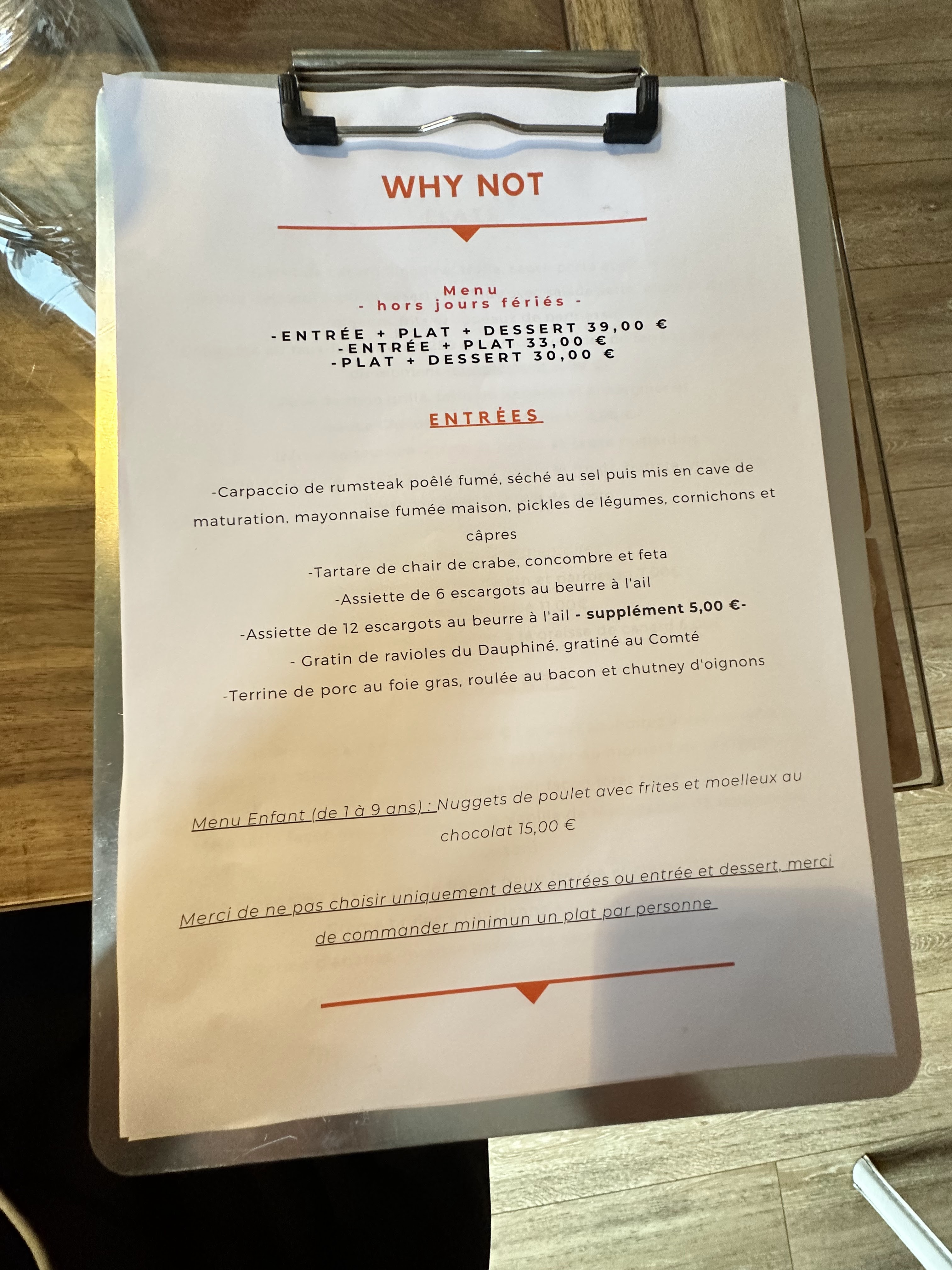 Première expérience au Why not décevante. Nous avons voulu tester le menu St Valentin à emporter, qui n'a pas été à la hauteur du tarif que nous avons réglé. Les portions sont très petites. Nous avons constaté une différence de poids de 50g entre nos deux entrée identiques (saumon gravlax).. C'est énorme! Les garnitures sont simples, presque inexistante pour le plat de poisson. Fromage quelconque. Le Saint-honoré etait minuscule... Les plats étaient plutôt bons dans l'ensemble mais très simples. Malheureusement ce que nous avons mangé ne reflète pas ce que l'on a pu voir sur les photos. Pour 35€ par personne nous nous attendions à mieux.