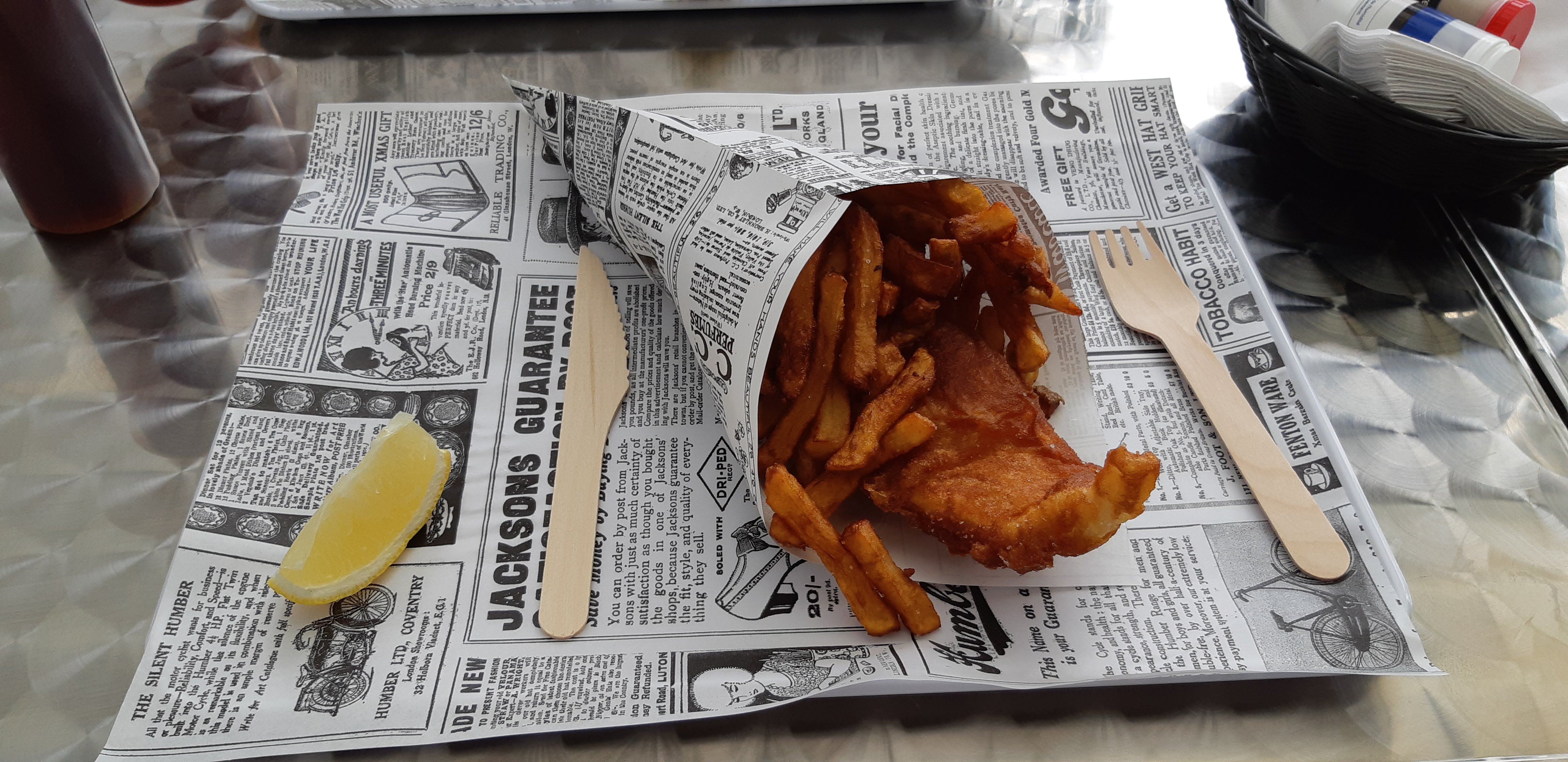 Fish and chips en take away, rapide et vraiment poisson excellent avec une batter parfaite: comme en Angleterre 😋