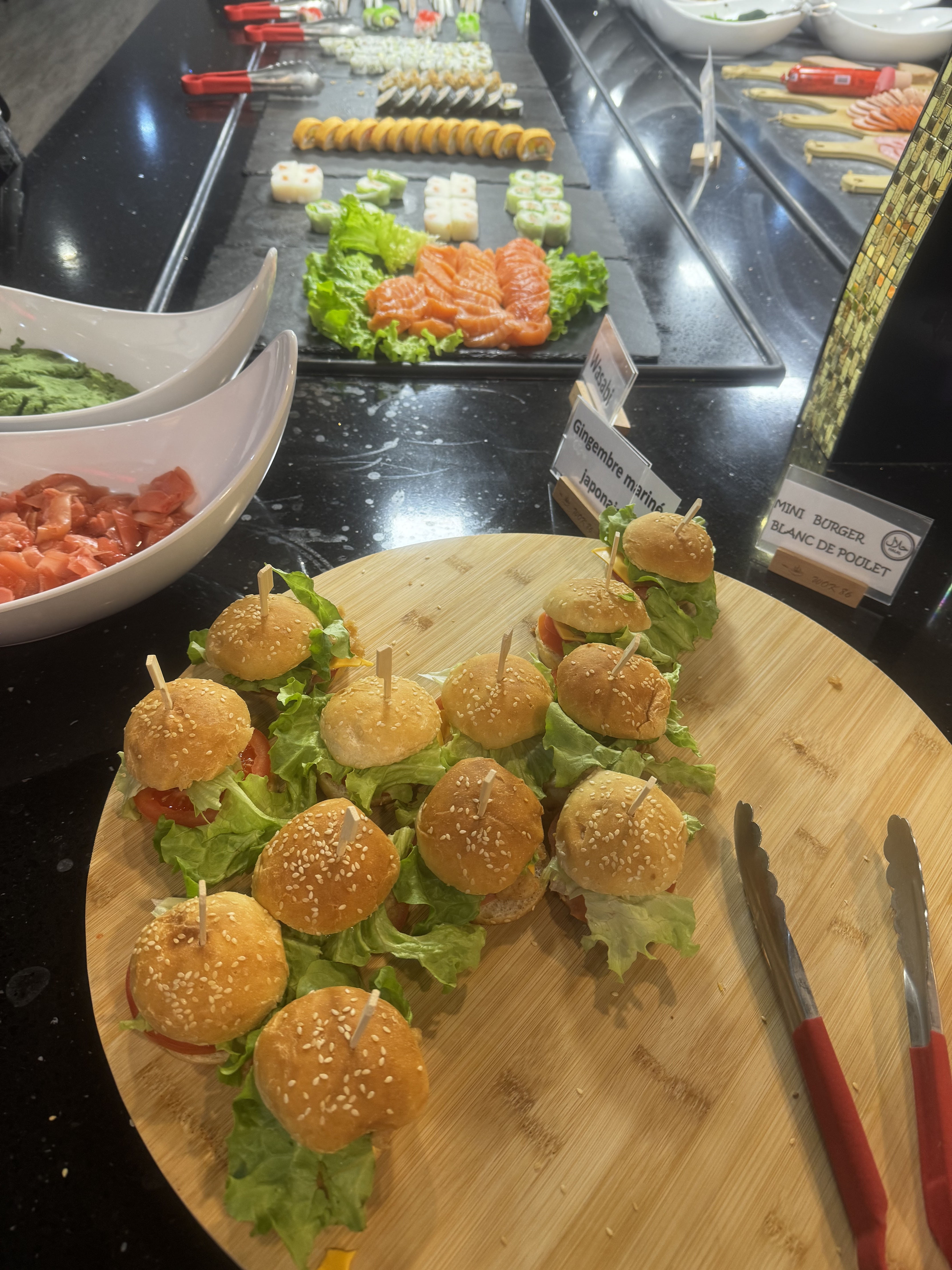 Première fois dans ce buffet à volonté . Bon choix de sushis et de makis pour femme enceinte . Le principe des boissons à volonté est un plus . Le prix du midi de 26.50€ est justifié au vu des boissons à volontés es et de la diversité des plats . Seul bémol les plats chaud comme les frites ne sont pas assez chaud. Les gyozas j’étais déçue , car la pâte est trop épaisse et sablonneuse Mais les langoustes et le fruit du dragon c’est la première fois que j’en voie dans un buffet . Le choix de charcuterie fromage et de viande est appréciable , ainsi que les sushis . Je compte revenir même après mon accouchement