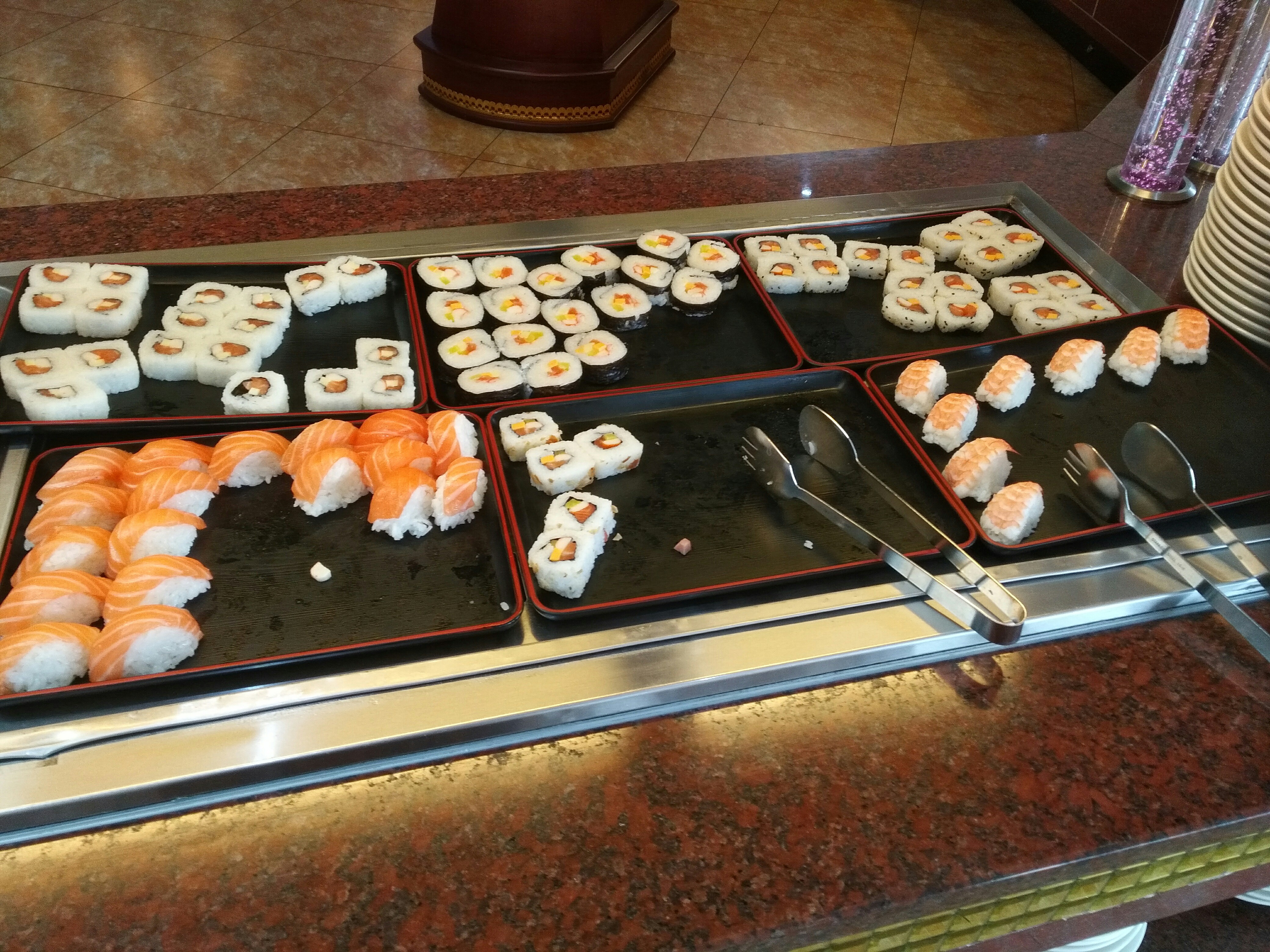 Pas terrible le saumon en sushi et sec sinon le reste ça va j'ai juste halluciné les dessert ne font pas envie surtout quand on voit des petit prince je vais pas au restaurant pour manger des biscuits et surtout les autres dessert de la veille et les fruit déjà découper remplie de moucherons les fruit de mer ne font pas envie quand on voit tout le reste