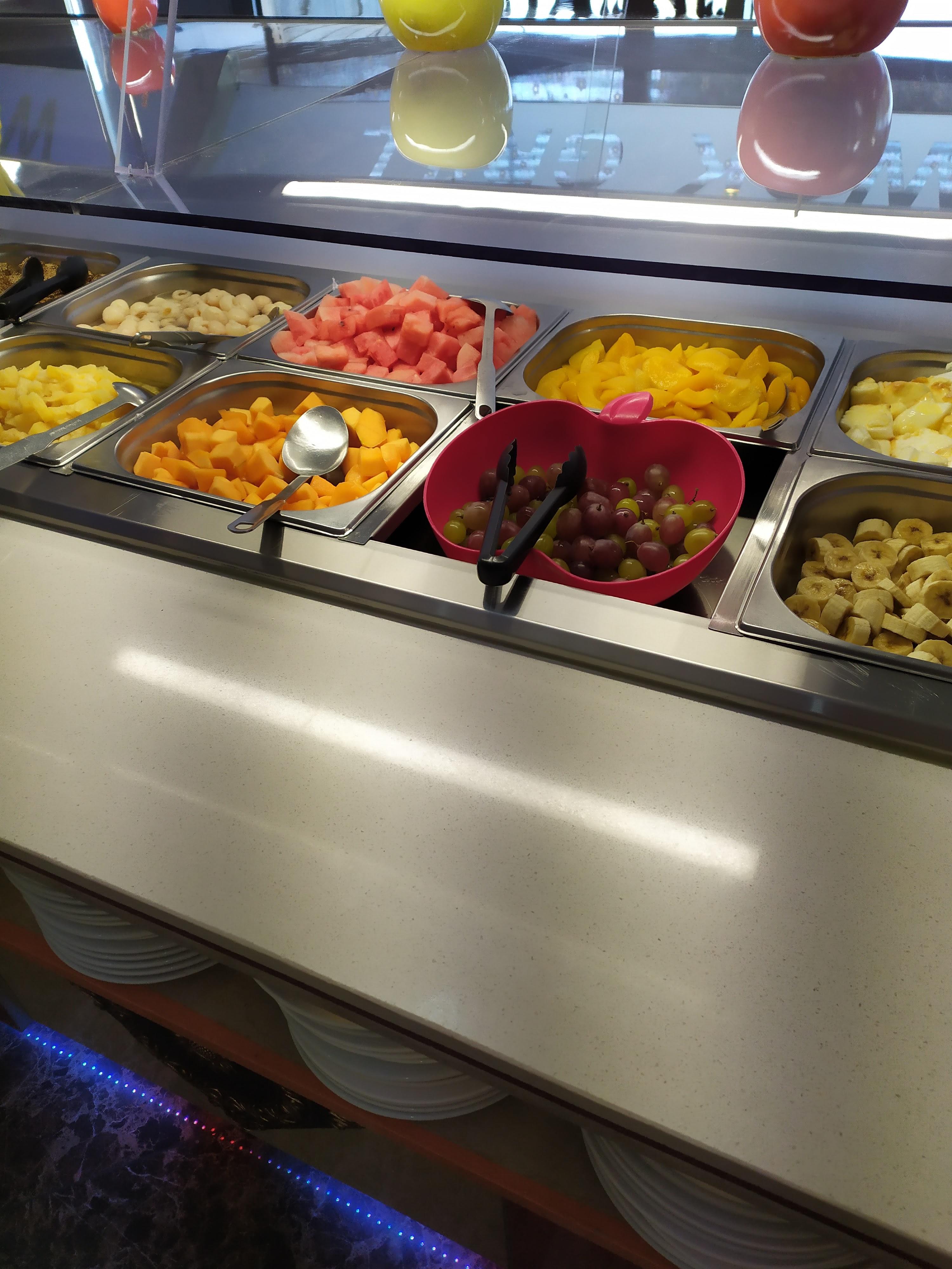 Belle présentation des plats avec lampes chauffantes sur le dessus. Partie grill/wok sur le côté. Très propre : la table ne colle pas. Idem pour le sol. Beaucoup de monde donc effet cantine bruyant mais pas plus que dans les autres établissements du même genre. Personnel discret et souriant. Nourriture variée.