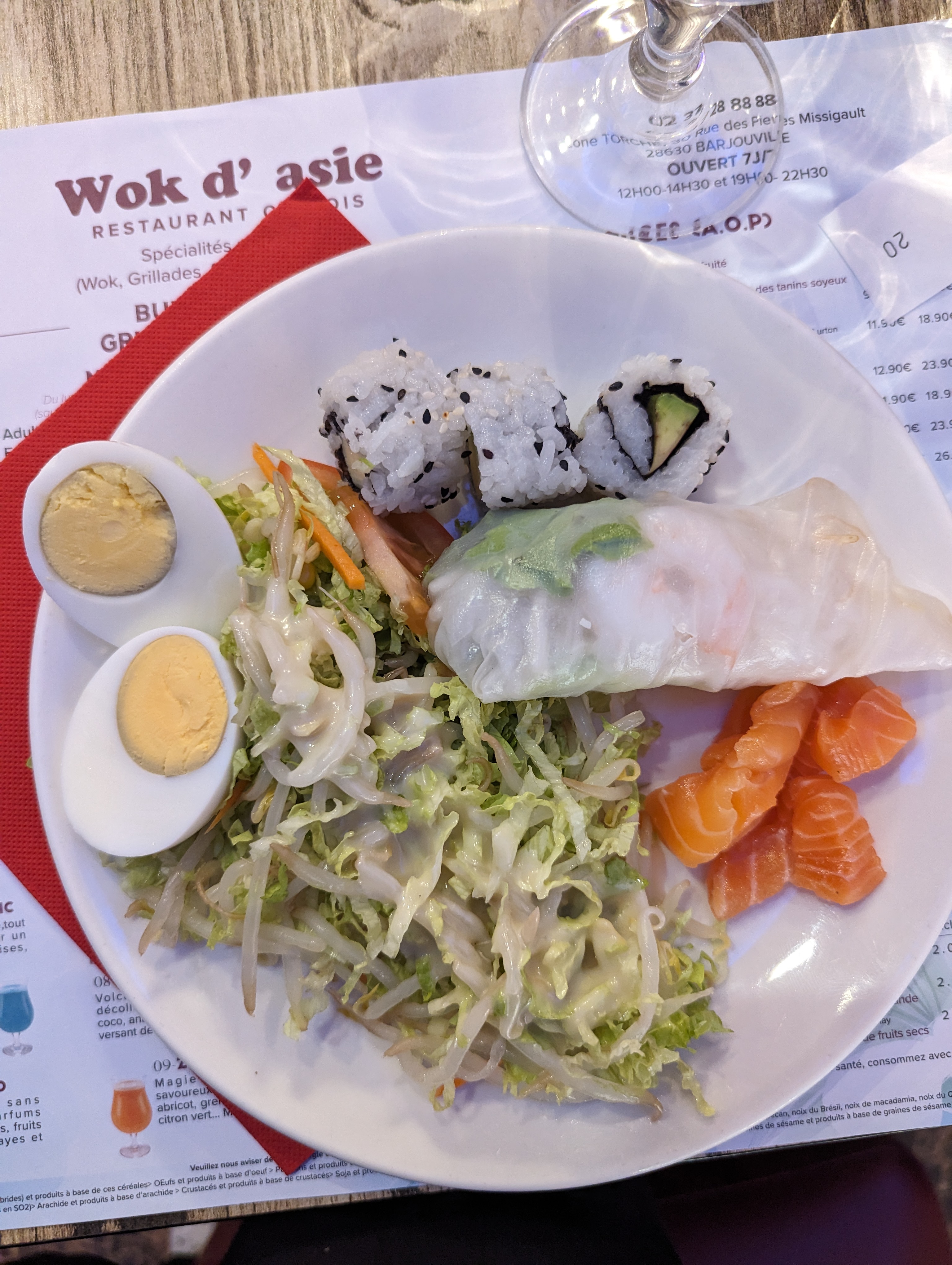 Très peu de choix, on comprend vite le prix, côté wok je pense que l'hygiène peut être a revoir : la préparation des makis, les spatule sale ré utilisé pour votre cuisine (qqun avant moi) puis gratter seulement pour préparer le client suivant (mon fils), et la cuisson des nouilles... Les produits restent frais mais on a vu clairement mieux sur Dreux