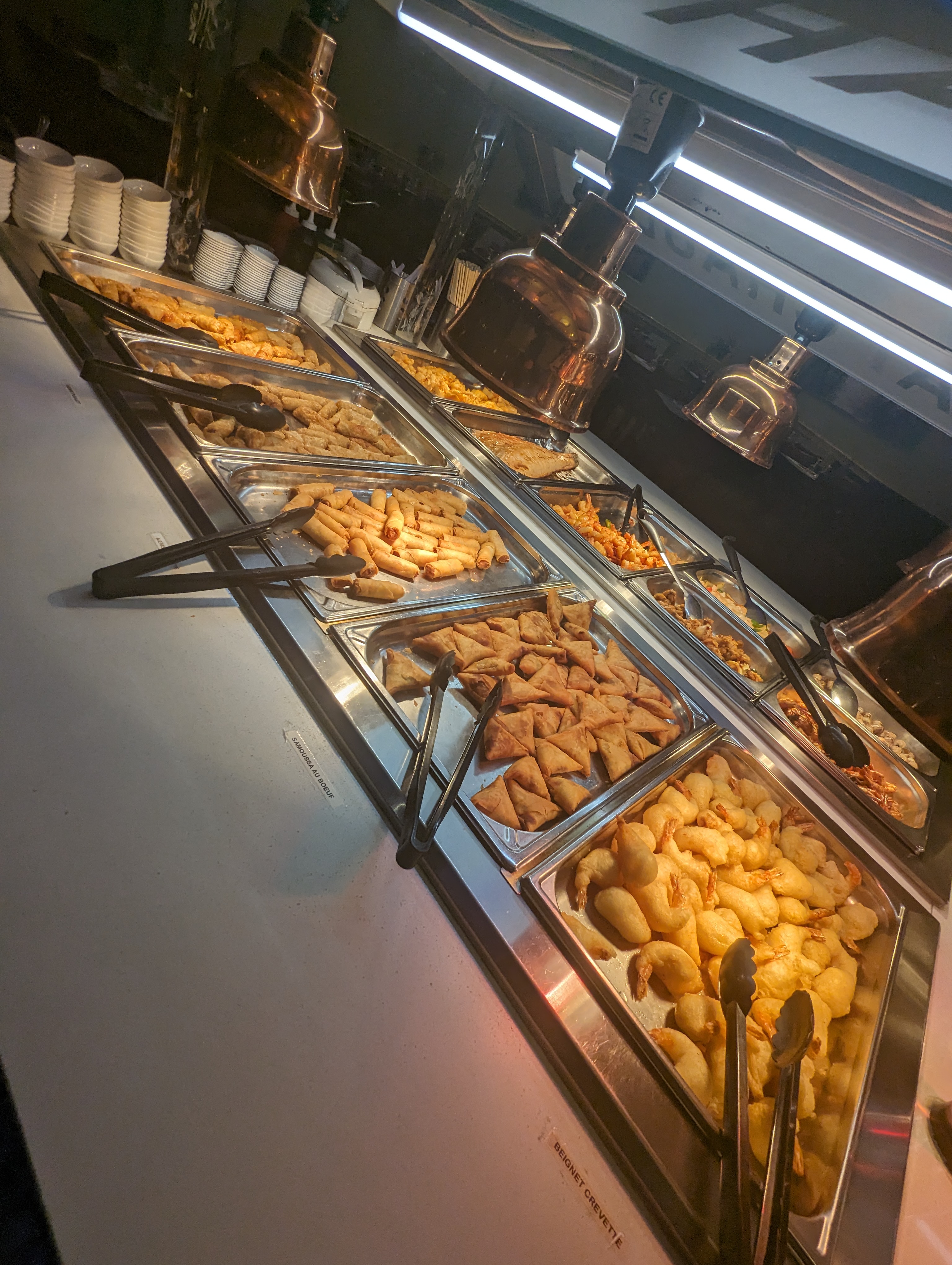 Service du soir. Arrivé à 21h15. Les plats ne sont pas réapprovisionnés. Les fruits de mer n’étaient pas du tout frais et donc immangeables. Les plats ne sont pas si variés que ça et surtout très très gras. On sent plus l’huile que les saveurs d’ailleurs pour la plupart inexistante. Les bouchées vapeurs aux crevettes étaient vraiment déguelasse. Au vu de la qualité du buffet, je n’ai pas tenté le wok. On a été installé à coté de leur meuble de rangement de vaisselles, je vous dis pas le bruit. Les serveurs claquaient les portes, jetaient les couverts. Déja que le resto est bruyant mais alors là. Je regrette de ne pas avoir suivi mon instinct et de ne pas m’être rendue à Hot chef à coté.
