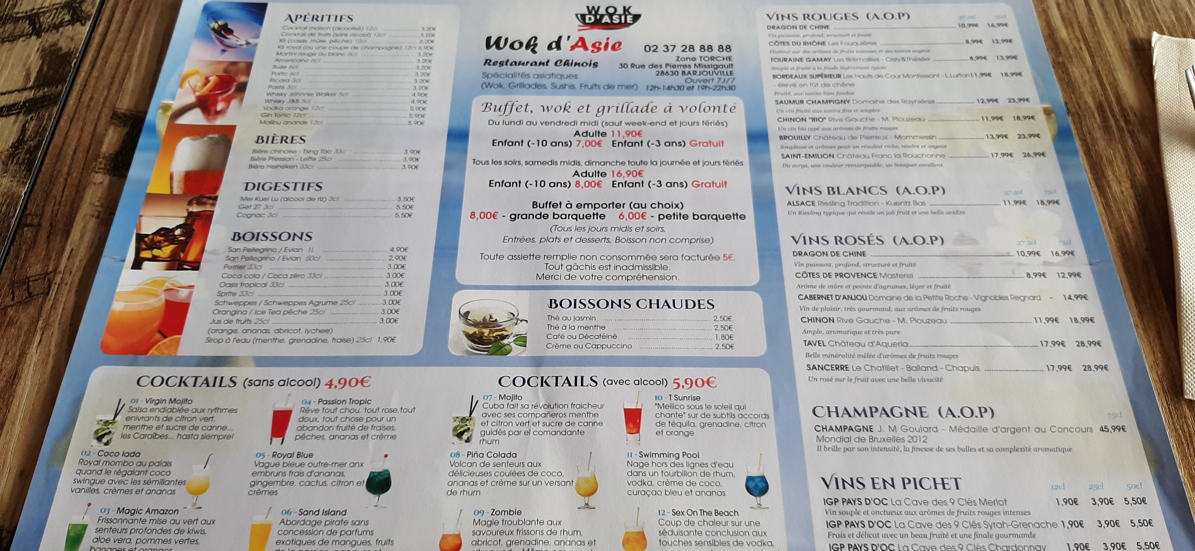Choix importants de plats ,ce n'est pas de la grande cuisine,mais le wok permet de personnaliser nos plats ce qui est un.plus. Pour 11,80€ le midi et 17€ le soir de l'entrée au dessert ,pas de quoi s'en priver
