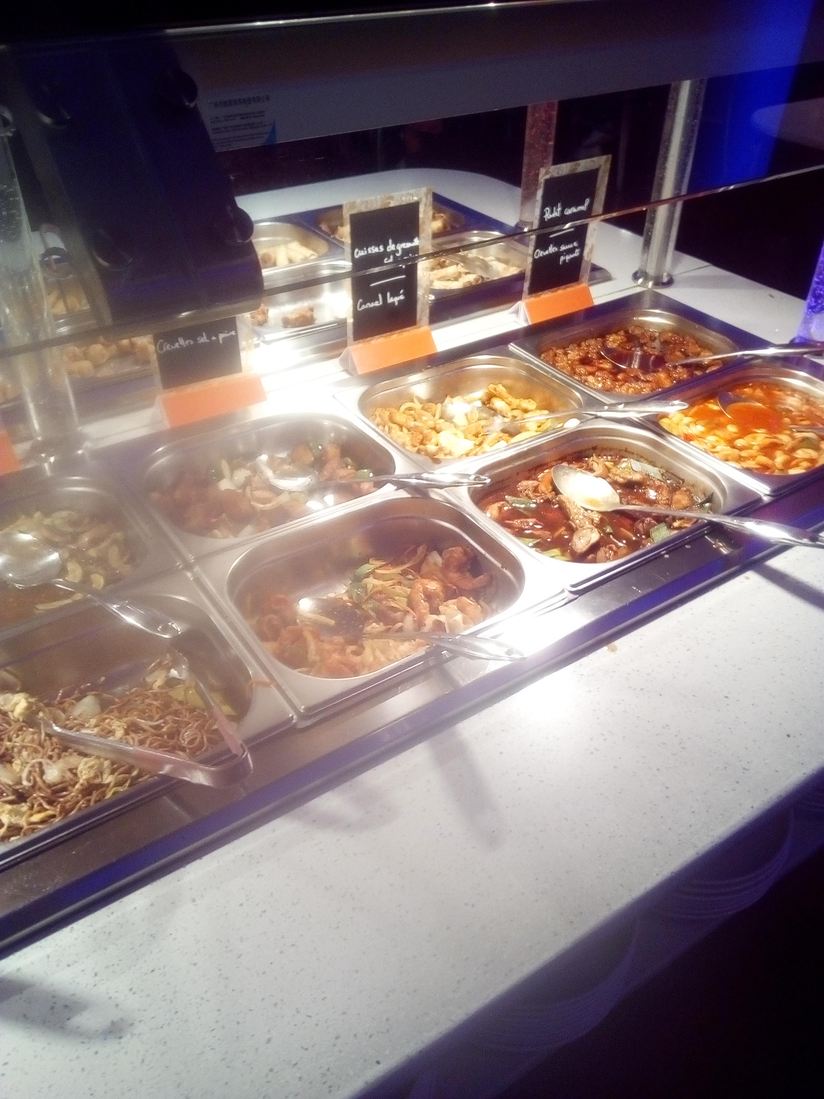 Le nouvel agencement est top, les différents buffet sont bien délimités ; on y trouve des coquillages (huitres, bulots...), des sushis, rolls et autres, nems, samossas et compagnies , riz cantonais et différents plats chauds de viandes ou de poissons et tout pour se faire un wok ou une plancha, le buffet des desserts est pas mal du tout avec glaces, mignardises, fruits et bonbons.