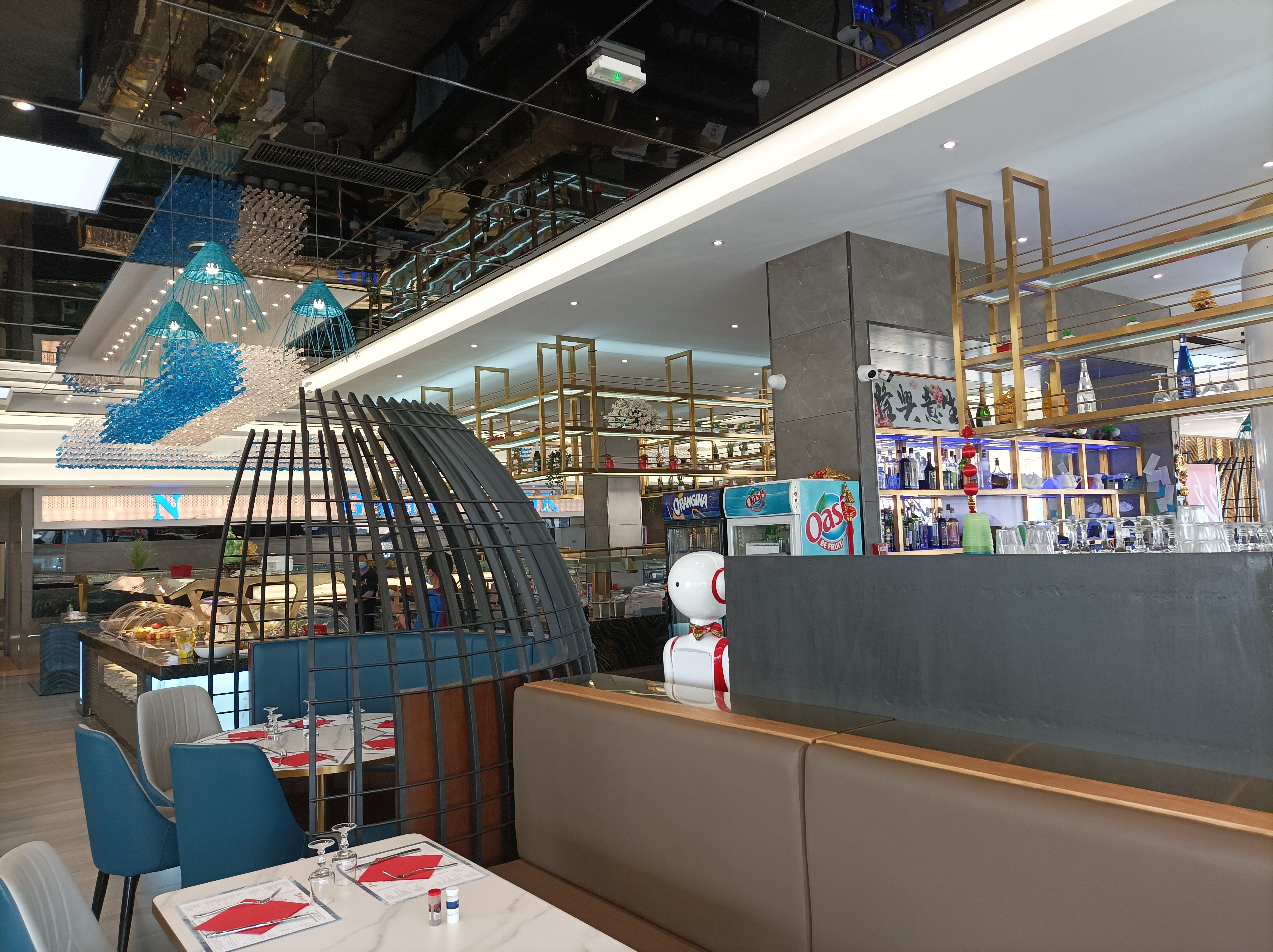 Le décor est chaleureux surtout quand on mange en famille dans les espace privés (petite cloche en bois). Pour la nourriture, large choix, Possibilité de wok, sushi, buffet chaud et froid pour petits et grand. J’adore !
