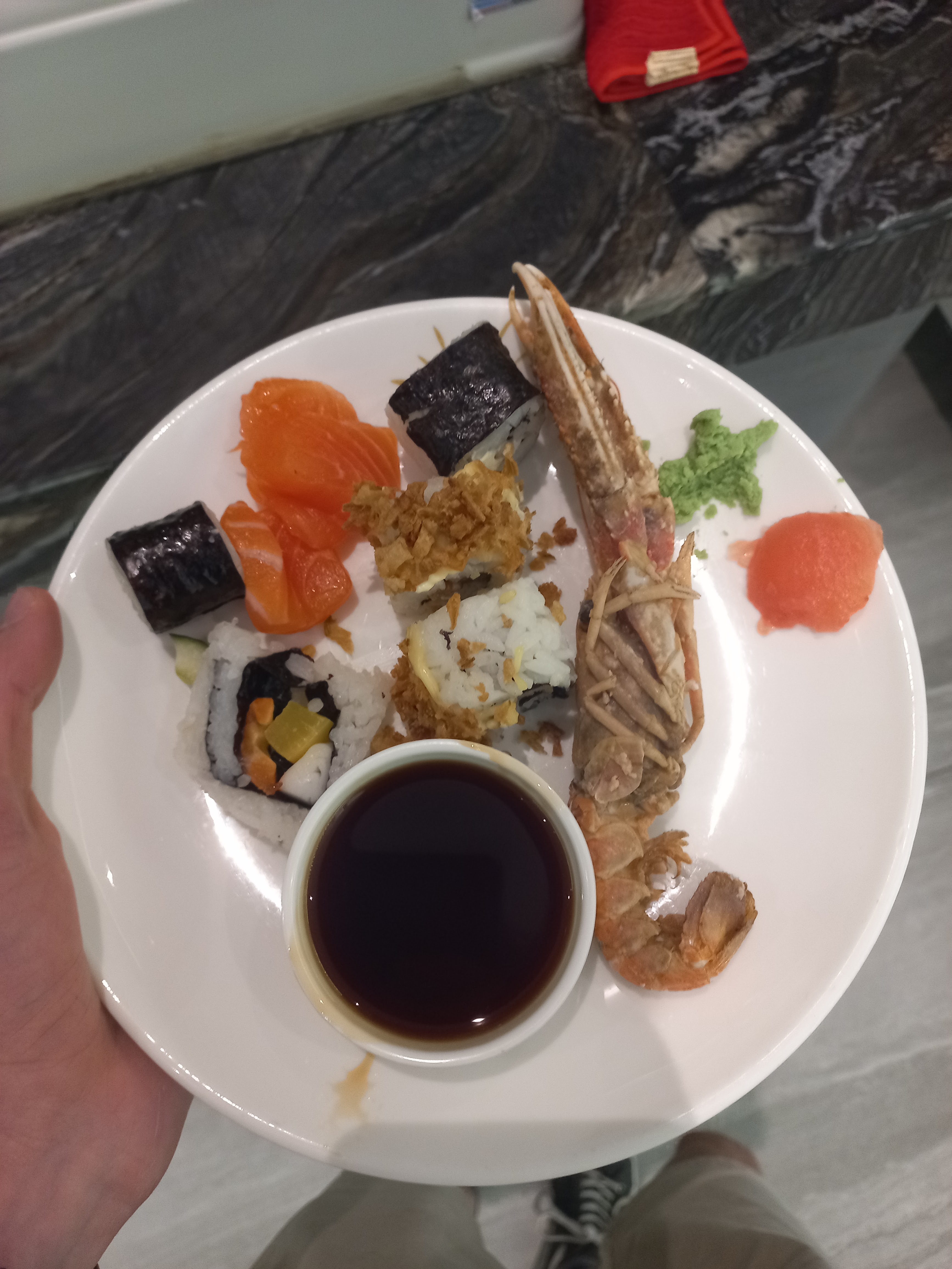 Très beaucoup de choix juste dommage que il y est pas des sashimi au thon mais en revanche il y en à au saumon il est dommage qu'il y est pas de temakie . Beaucoup de Mondes du coup car c'est une zone industrielle sinon grand parking et grand choix pour manger autant français que asiatique