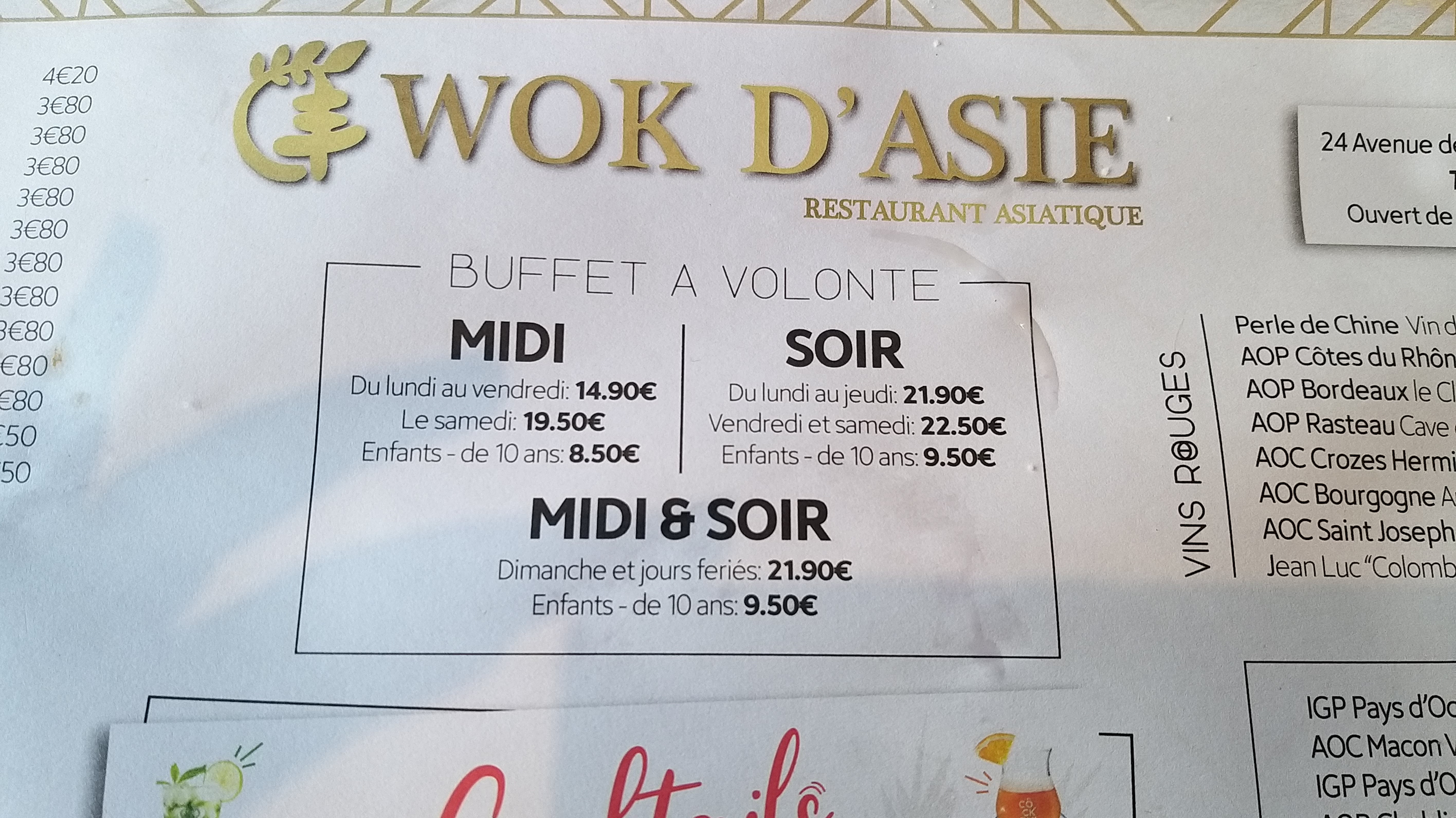 Tres bon restaurant, cuisine de qualité avec beaucoups de choix pour que chacun y trouve son bonheur, beau restaurant avec une jolie décoration qui change des restaurants dit a volonté, service de qualité. Buffet en 6 parties - Coin fritures : (nuggets, frites, brochettes de poulets, chicken donuts, guyoza, beignets de crevettes, nems ect...) - Coin froid : Salade bar, fruits de mer, sushi, charcuterie ect...) - Coin Wok/Grillade ( Steak, entrecôte, Crevettes, Poissons, légumes découper, nouilles, pâte de riz ect...) - Coin plats préparé ( bœuf aux oignons, saumon, escargots, Crevettes piquante, Pomme de terre sauté, légumes, et soupe maison Je vous la recommande ect...) - Coin desserts ( Fruits frais, salade de fruits, yaourt, gâteaux, crème brûlée, panacota, donuts, mousse de fruits ect ...) - Coin bar à bonbons + boules de glace ou glace à l'italienne. A l'occasion aller y faire un tour ça en vaut le détour.