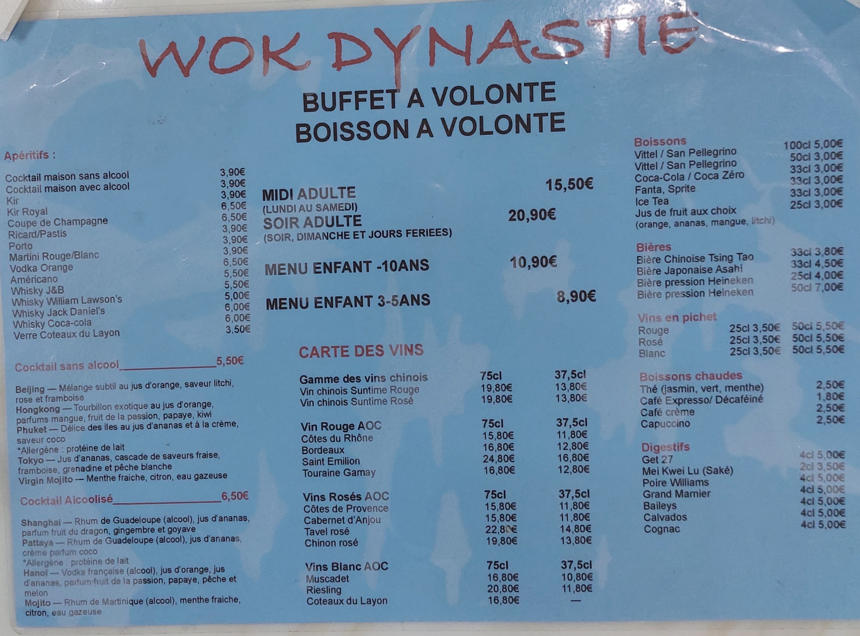 ALLEZ POUR LA DERNIÈRE FOIS SUR VOTRE SITE .....Bonjour Mme et Mrs les dirigeants. Pourquoi supprimez-vous les commentaires pas très élogieux pour votre restaurant mais PLEIN DE VÉRITÉ ? Cela fait 15 fois que vous le faites avec mon commentaire !!!! Ce n’est pas très honnête de votre part ou avez-vous des choses à cacher ? Commentaire supprimé ci après…. Le 01 Février 2024. Bonjour Mme et Mrs les dirigeants du Wok Dynastie. Vous dites que les boissons sont comprises dans le prix du menu et bien cela est archi faux !!! Je m'explique: nous étions 3 à table et n'avons pris aucun boisson sucrée ou bière dans le réfrigérateur de la salle juste un pichet d'eau du robinet. Par contre nous avons demandé 2 carafes 50cl de vin blanc. J'ai demandé à ne payer qu'une carafe de vin blanc (5,50€ unité) n'ayant pris aucune boisson ailleurs et bien cela m'a été refusé sous prétexte que c'était du vin. Donc pour résumer si vous prenez chacun 2 boissons sucrées ou bières donc 6 pour notre table à peut-être 1,50€ chaque donc pour nous 3, 9€ vous pouvez boire gratos par contre le vin pas le droit. Je trouve cette façon de faire un peu limite. Une boisson comprise est une boisson comprise surtout pour un prix équivalent.....J'ai pourtant beaucoup argumenté mais rien à faire, je suis tombée devant un mur !!!! C'est décevant et je trouve que c'est une publicité mensongère pour appâter le client. Ce ne sont pas des façons de faire et ce n'est pas comme cela que vous ferez venir des clients. Cordialement quand même ....Sylvie B