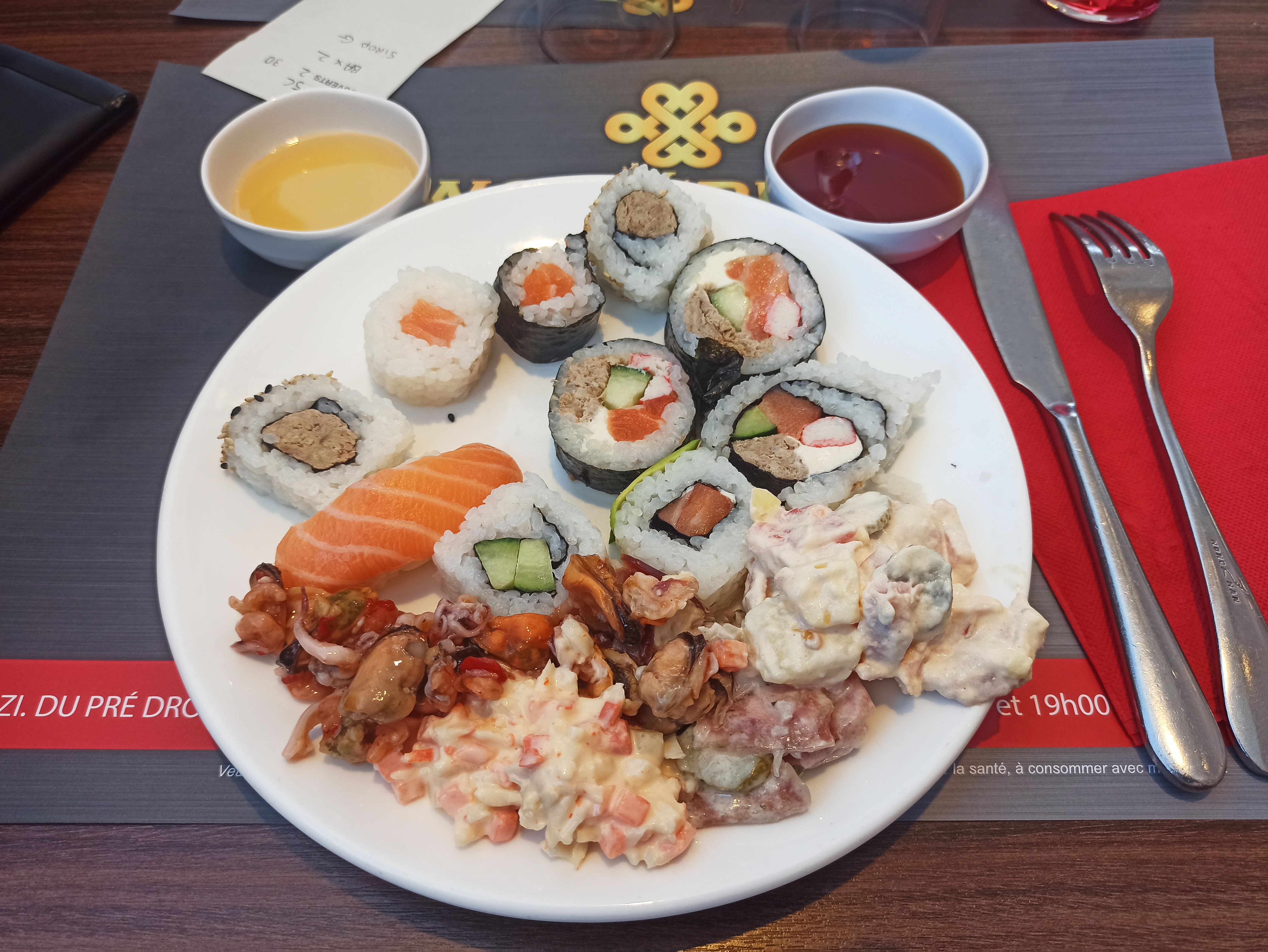 Génial, très bon resto avc beaucoup de choix, assiettes et boissons (non alcoolisées) a volonté, quelques choix de sushis sachimi, saki...ect et porc ou canard laqué, riz et pâtes chinoises, sauces chinoises ... beaucoup de menus asiatiques que je vous conseil de tester ... Ainsi que pas mal de fruit de mer ... Je vous conseil surtout les ingrédients cru a aller faire cuire au Wok en direct, devant vous, avec la sauce de votre choix, en 2minutes C cuit et c'est hyper bon *_* 😍😜 je vous conseil également les sushis les fruits de mer les bulot et les crevettes .. Après, pour ceux qui ne sont pas du tout fan de la cuisine chinoise ou japonaise : Ne vous inquiétez pas il y a également pas mal de choix international tel que des frites des poetatos, des pommes de terre, du riz, des légumes verts, des viandes rouges ou viande blanche comme de la volaille , du poulet du canard ect ... Je vous conseil les brochettes de canard laqué pour les amateurs de viande ou bien-sûr les viandes rouges crue cuite en express au wok ... Avc la sauce de votre choix ;) il ya quelque choix en desserts de tt sorte également et a la fin , quand on va payer au bar , on a droit au fameux Saké gratuit, (alcool très fort asiatique, a base d'alcool de riz / degrés d'alcool au mm niveau que l'alcool de mirabelle par exemple, perso je trouve que C fort mais C la tradition et sa aide a digérer ... En général on a le ventre bien plein quand on ressort de ce genre de restaurant ... Bon appétit ;)