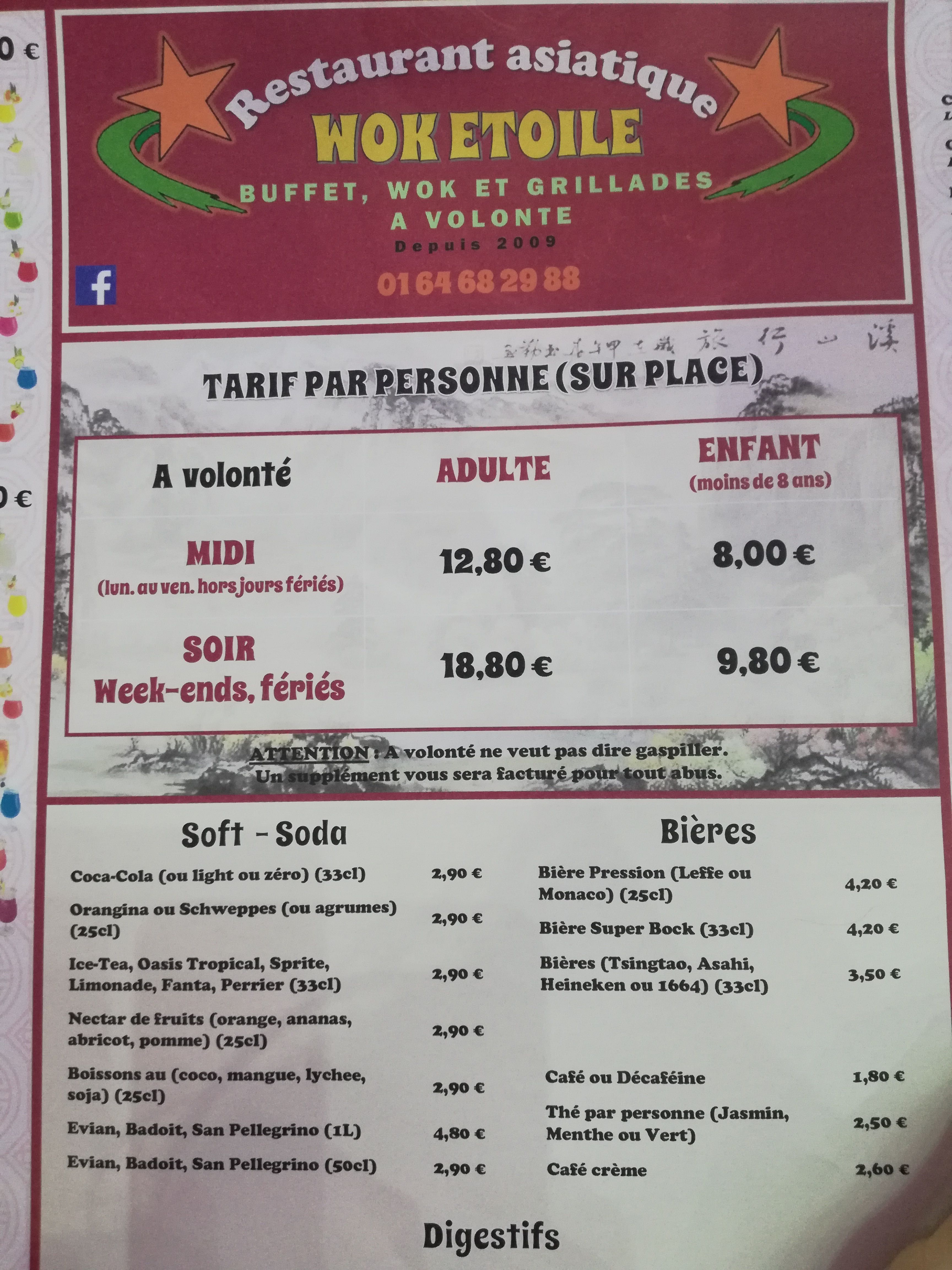 Mise à jour : je change mon avis et retire deux étoiles. Quand un restaurant à volonté ne refait pas le stock de sushis, ça n'est juste pas possible. Deux fois j'y suis retourné, et deux fois il n'y avait plus de sushis. Quand q la fontaine de chocolat, elle était éteinte. Je n'y retournerai plus. Excellent restaurant à volonté. On y trouve de très bons sushis et makis. Il y a tout ce qu'il faut pour faire des woks, mais aussi des brochettes de boeuf au fromage, des nouilles, du poulet au caramel etc... Ce qui est appréciable, c'est qu'il y a des raviolis et des bouchées aux crevettes, mais également au porc. Pour ceux qui en mangent, je vous recommande les raviolis pékinois au porc qui sont vraiment délicieux avec une petite sauce piquante. Il y a aussi de nombreux desserts, des glaces, des crêpes, des parts de gâteaux, er des fruits découpés. J'adore les fruits découpés, parce qu'à wok étoiles, il y a une fontaine de chocolat :D Autre gros avantage, le parking est partagé avec intermarché. Donc, même en soirée le week end, et vu que l'intermarché est fermé, il y a toujours de la place pour se garer. Je vous le recommande vivement.