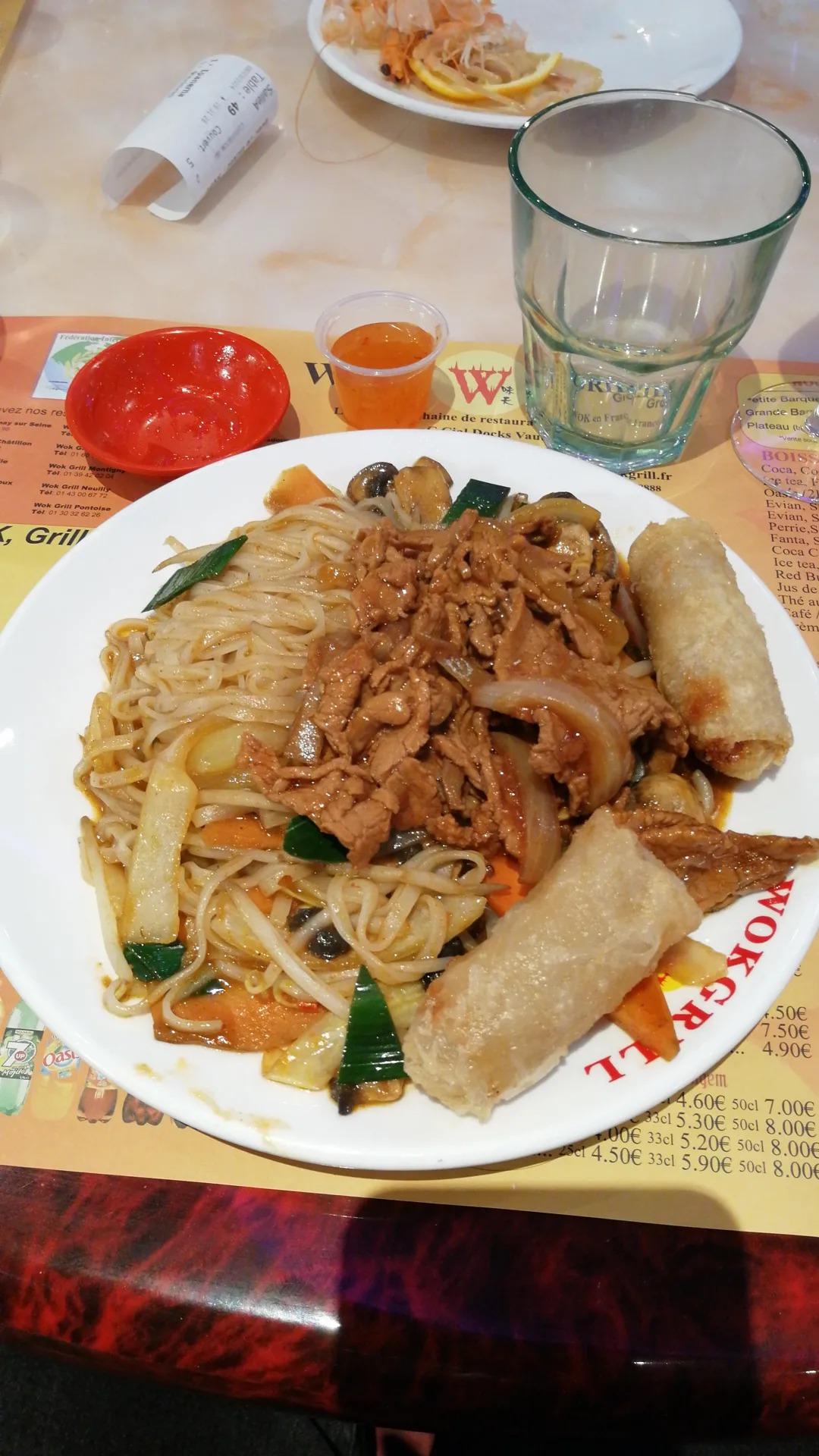 Alors les pates asiatiques sont surcuites Les langoustines sont surgeles . Les crevettes petites et ont gout de flotte Le canard laque trop trop cuit En fait ya pas de cuisine cest juste de la decobgelation et de la mise en plat. Le flanc les macarons cest du surgele bas bas de gamme. VRaiment tres bas Pas pu finir certains plats telleme.t mauvais. Cote ambiance Pour le service il tammene meme pas une bouteille de flotte. Atteindre le buffet cest comme se battre dans le metro parisien pour avoir une place assise a chatelet. Adieu la chaine wok grill group....