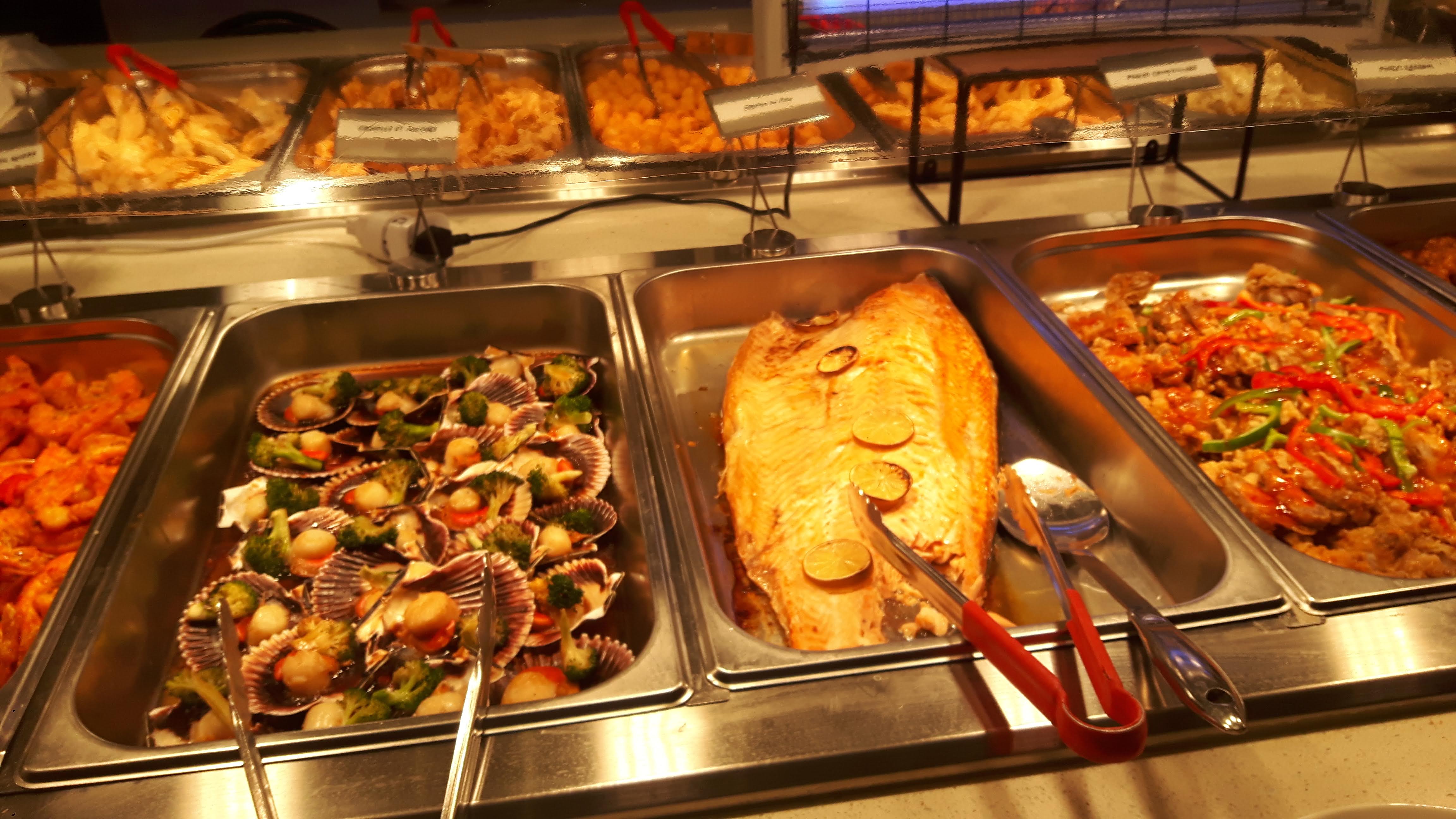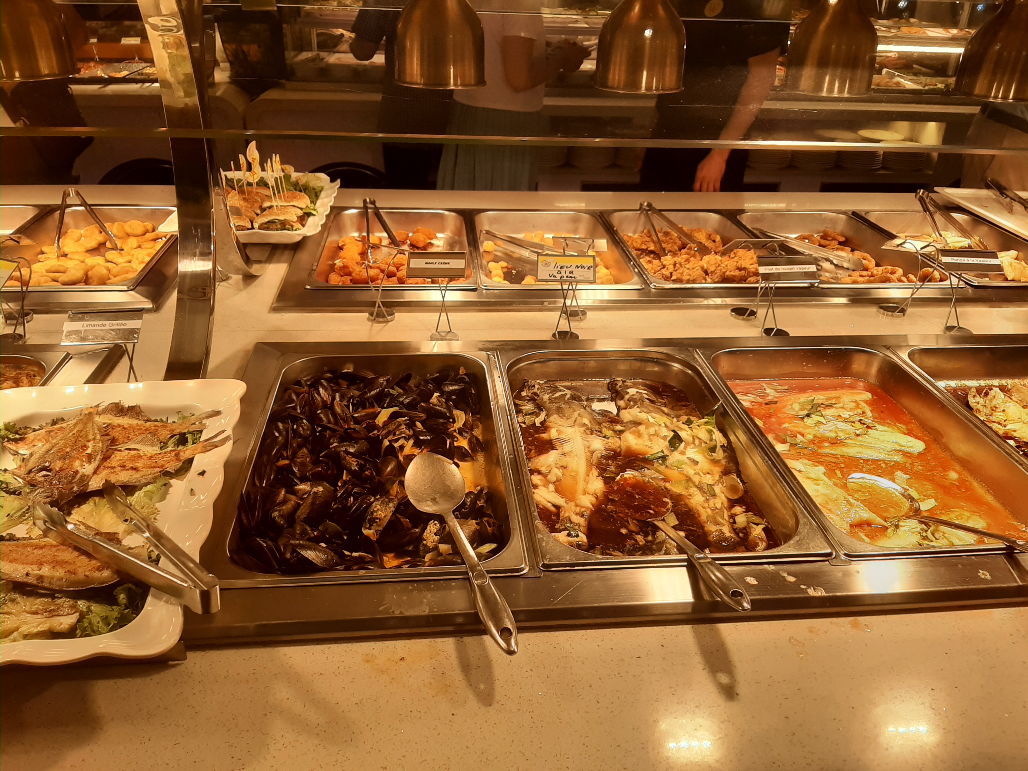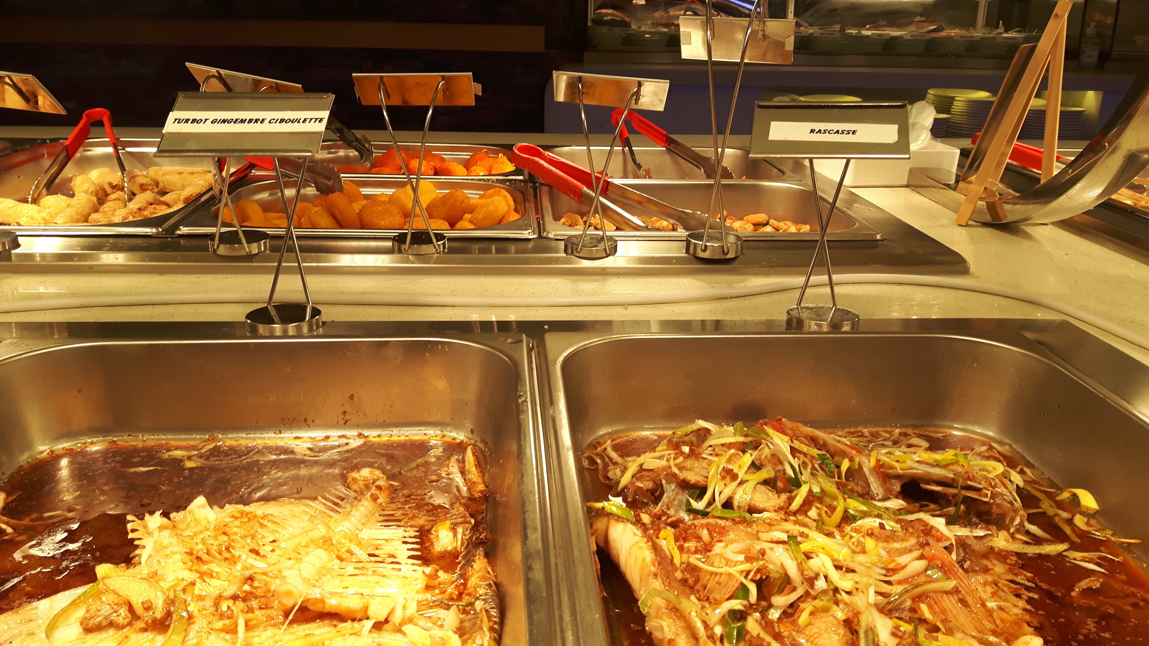 Un buffet à volonté comme vous en verrez rarement. De bons produits frais et un vaste choix : Turbot gingembre et ciboulette, saumon entier, rascasse, écrevisses, tourteaux, huîtres, sole, canard laqué, crevettes au poivre du Sichuan, sushis, burgers, entrecôte, ... Vraiment inépuisable. Les prix varient selon les jours et les heures.