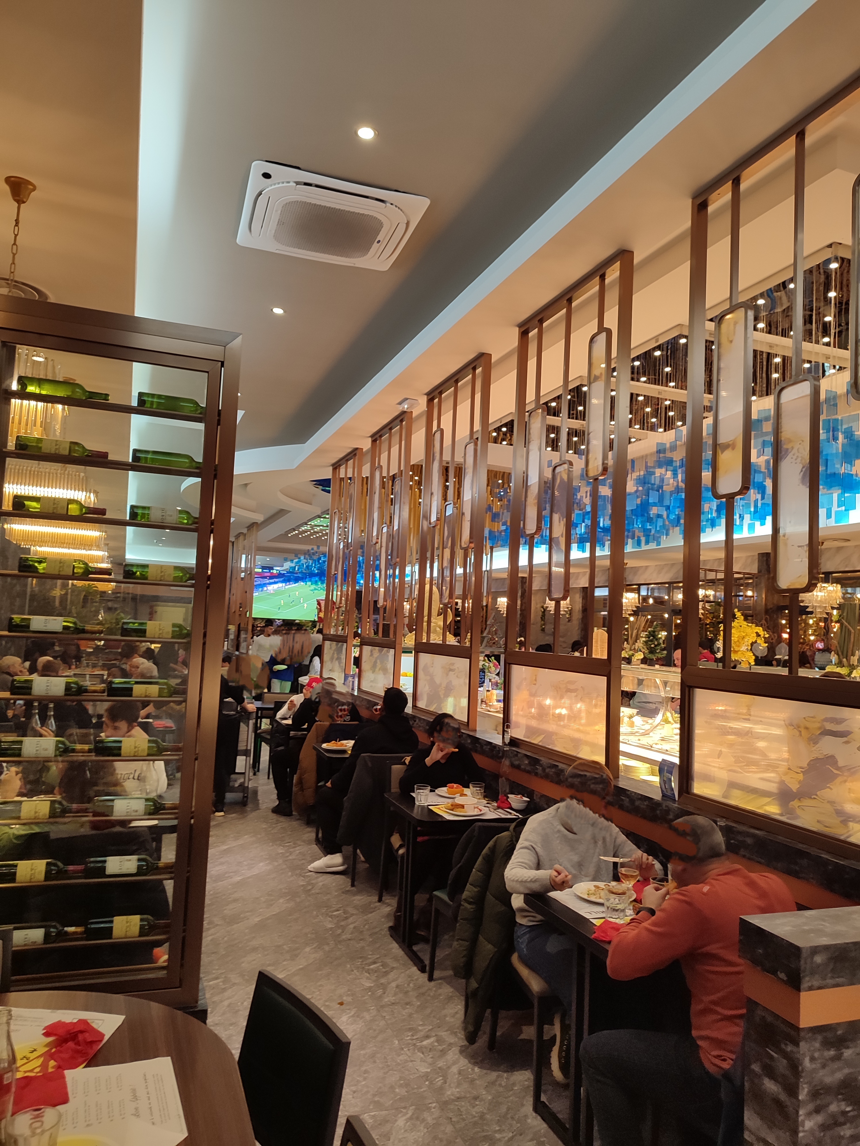 Un restaurant dans un entrepôt, beaucoup de monde = ambiance cantine super bruyante, manque de réassort des plat, donc soit on attends (pas mal) soit on prends autre chose, le serveur plutôt désagréable qui nous demande de partir à 22h45 (repas d'anni à 19 personnes), qui refuse qu'on emporte les 2 parts de gateau déjà sur la table, certains plats pas frais (calamars fris). le tout à 23€90 par personne. Donc expérience à ne pas renouveler.