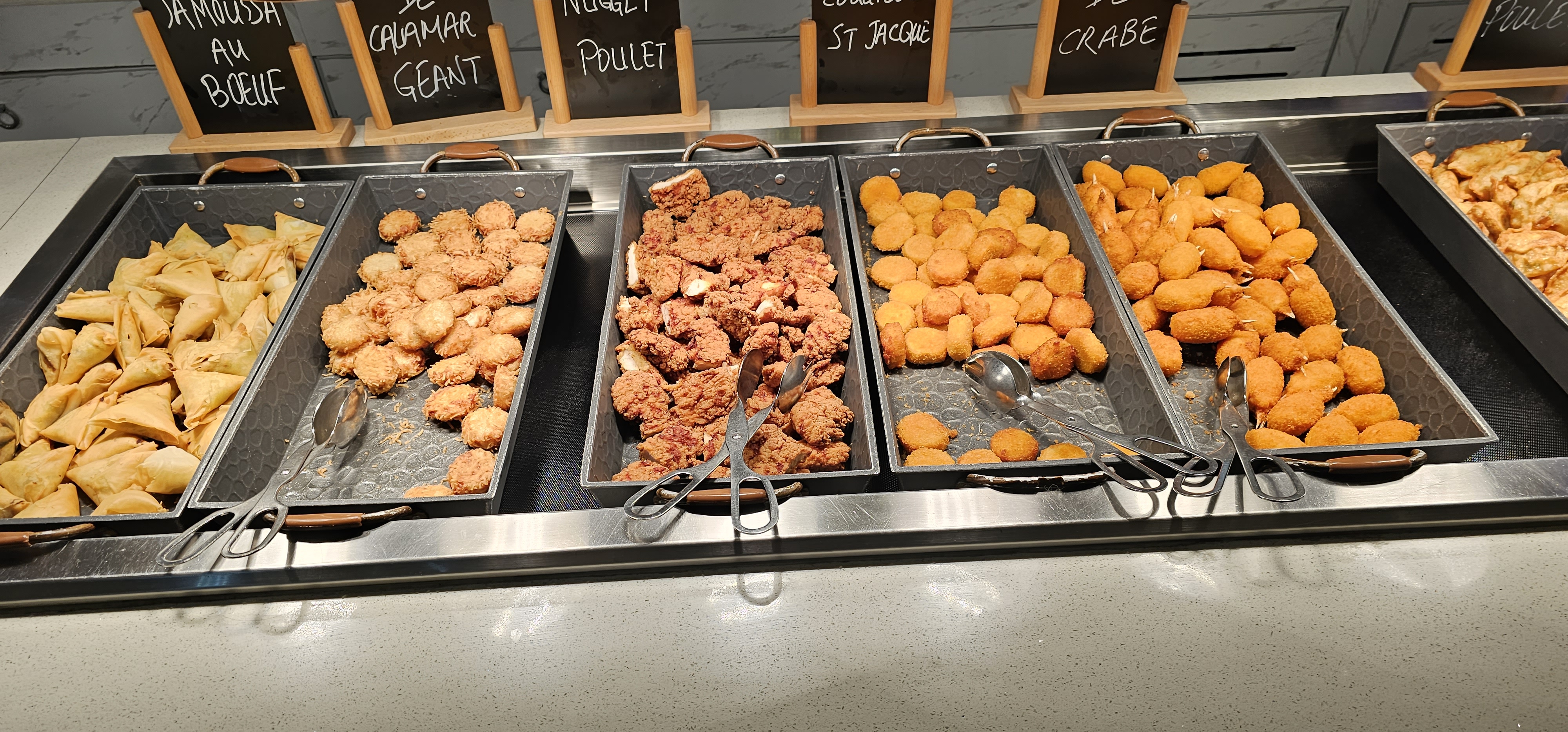 Il y a de tout et de tous les goûts. Vous y trouverez aussi bien des sushis que des œufs mimosas ou salade niçoise... Du steak, des cuisses de grenouilles comme du poissons...le tout déjà cuits ou à faire cuire par les chefs. Des fruits mers au nems en passant par le porc croustillant ou du poisson. Par ailleurs le poisson est cuit comme il faut... En dessert, on a que l'embarras du choix: fruits, gâteaux, fontaines de chocolats