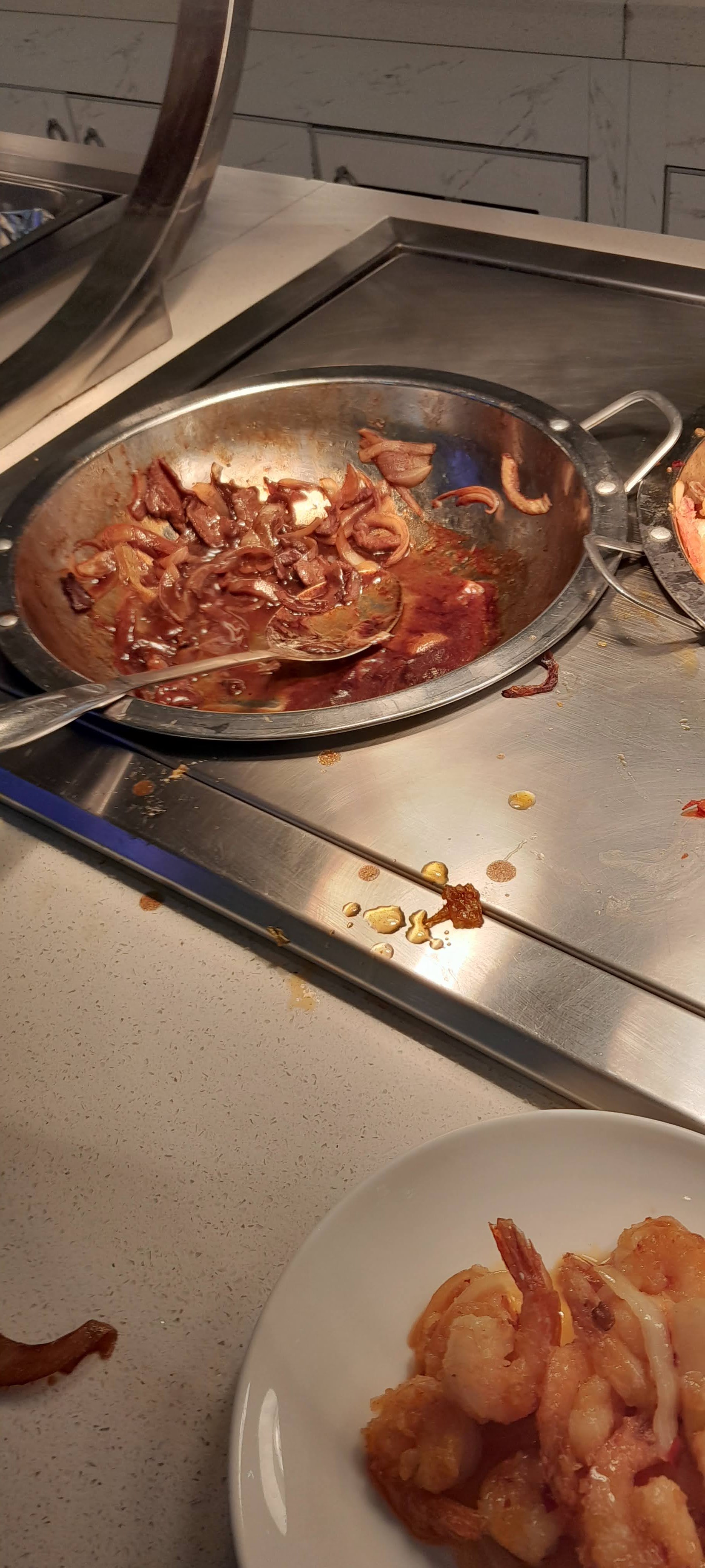 J’y suis allée un lundi midi. Beaucoup de places vides. L’accueil n’est pas souriant. J’ai apprécié l’espace autour de chaque table. Les chaises dos à dos laissent un passage sans que les convives aient à bouger leur sièges. Les sièges sont confortables. Grand espace, pas trop de monde, donc pas bruyant à l’excès. On est lundi, est-ce pour cela qu’il y a beaucoup de places vides dans le buffet ? Pas de fruits de mer, comme lu dans certains commentaires. Les plats vides ne sont pas rechargés . Dans l’ensemble, je trouve que les plats manquent de saveur. C’est très fade. Il y a un coin avec des sauces asiatiques, encore faut-il savoir laquelle choisir. Il y a des rouleaux de printemps que je ne recommande pas. En fait ce sont des vermicelles cuit à l’eau, roulés dans une feuille de laitue puis dans une galette de riz. Pas d’herbes, pas de carottes, pas de crevette ou de cervelas chinois. Il n’y a pas de menthe. C’est d’une fadeur extrême. Les nems, samousas sont très fades, mal garnis. J’ai testé le wok. Il met mes crevettes , poulpes et légumes crus à cuire dans un bouillon.c’est un peu long. Puis, il me demande quelle sauce en montrant une affiche placardée sur le mur. Il faut au moins dix minutes d’attente. Puis il fait chauffer la sauce dans le wok. Une à deux minutes. Et il verse tous mes ingrédients sortis du bouillon et égouttés dans le wok. Cuisson spectaculaire, Avec les flammes qui s’élèvent haut autour et dans le wok. Encore dix petites minutes. C’est très très fade. Je ne trouve pas de sel. Il n’y a pas de citron. L’encornet est immangeable, très dur. Il y a plusieurs sortes de poissons à faire à la plancha, ainsi que viandes et merguez. Ça c’est top. Pour les desserts, déception. Crème brûlée industrielle. De nombreux gâteaux (industriels). Des verrines à gogo. Et des fruits frais coupés depuis longtemps car ils ont perdus leur saveur. Ils ont dû rester longtemps au frigo car ils sont ramollis. Si vous voulez des fruits, prenez les au début car ce n’est pas rechargé. Quand vient votre tour il n’y a plus rien. Globalement, ce n’est pas un lieu de gastronomie, mais chacun peut y trouver quelque chose à son goût. On n’est pas bousculé, on peut prendre tout son temps. L’espace est grand, on ne se sent pas oppressé et on peut apprécier ce moment avec des amis. Je pense y retourner un autre jour que le lundi.