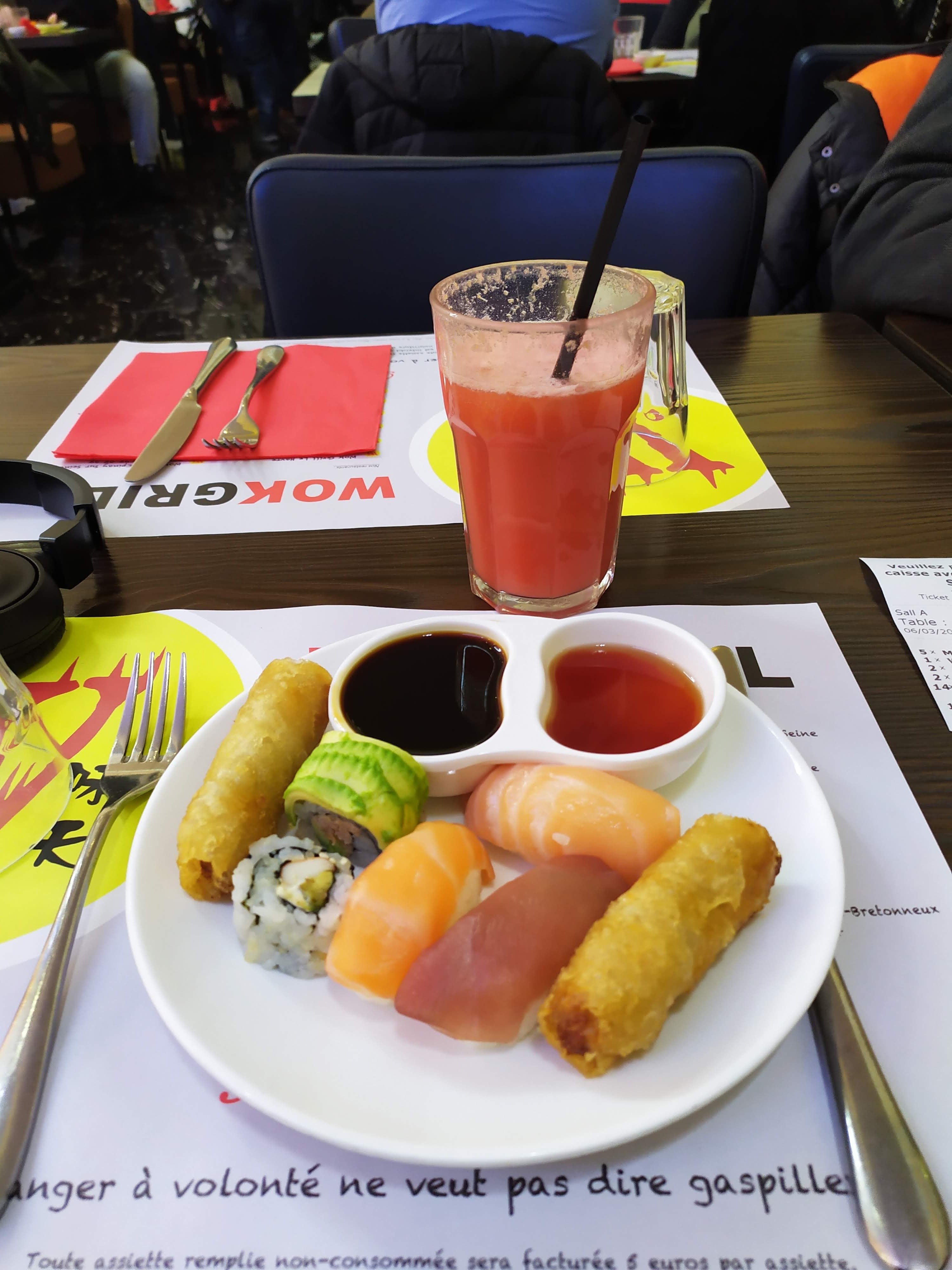 Bon wok qui propose beaucoup de choix et de variété de makis, brochettes, riz etc. Le seul soucis serait qu'il n'y a pas de boisson a volonté et que le samedi quand c'est bondé de monde, les places de parking se font rares.
