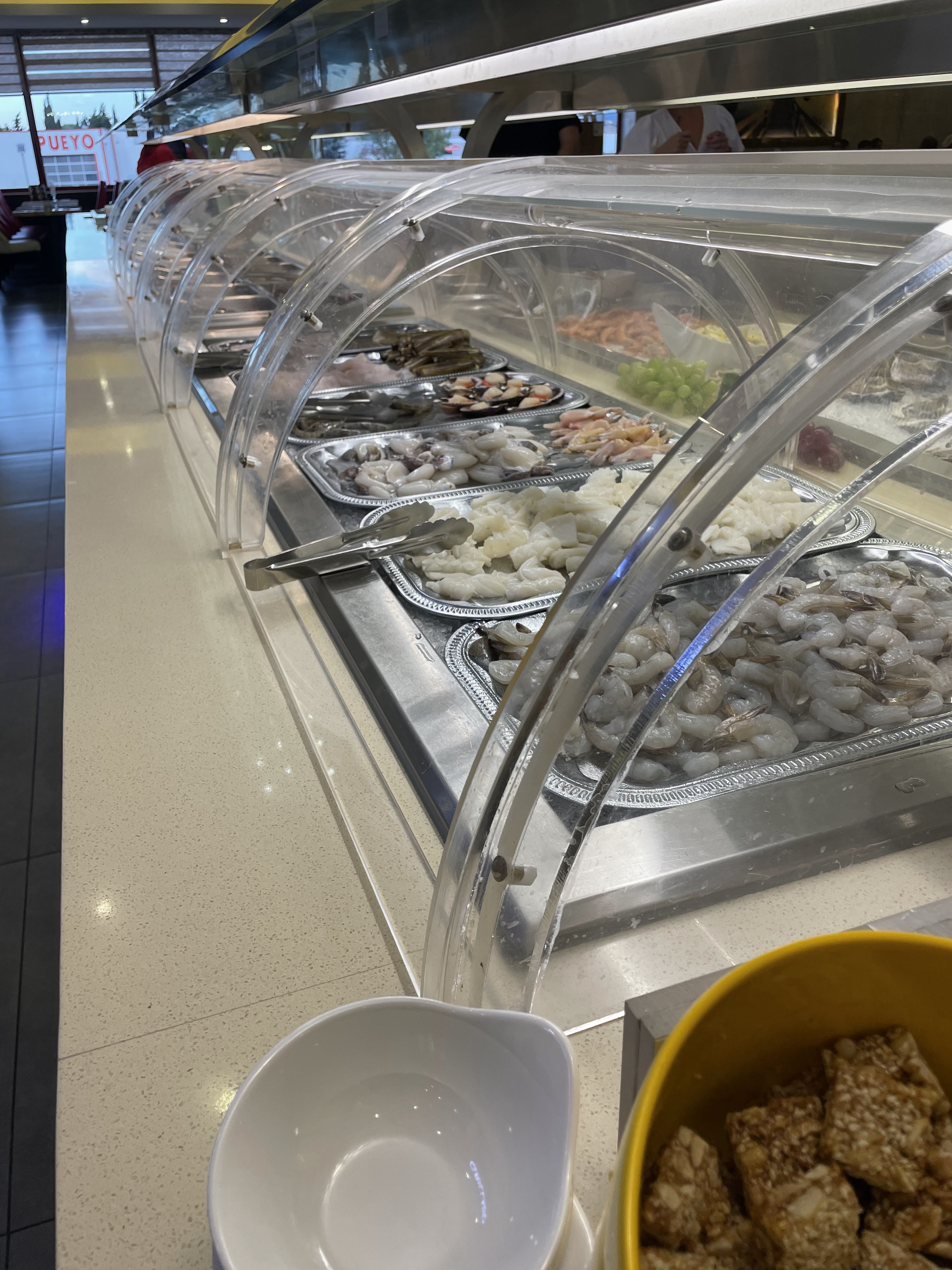 Vitrines ouvertes, donc passage de mouches partout (obligé de les chasser , j’ai voulu essayer de fermer mais aucune fermeture pour protéger la nourriture) , viande rouge commençant à noircir, même pour dessert (panacotta) il reste des résidus sur le verre… pas bon aussi… et en plus de tout ça, sans même voir si ça vaut le coût, on paye avant d’entré 🙃 si on avait vu tout ça avant, on serait sorti direct. Mais personnel gentil..