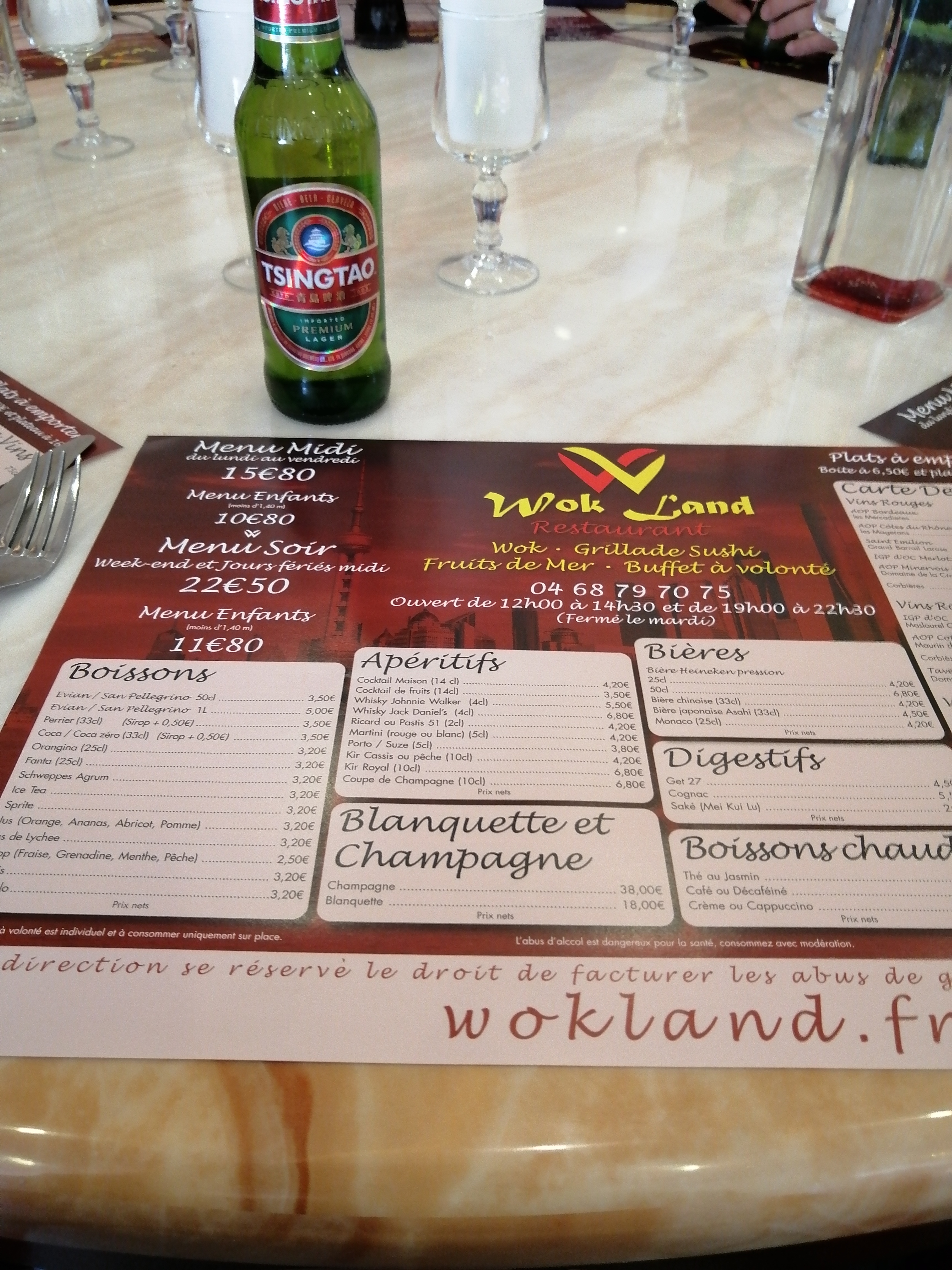Dès l’entrée, ravis, cela nous rappelle les restaurants traditionnels et bon marché de Taiwan. Un peu surpris de devoir payer tout de suite, ont-ils peur que les clients partent sans payer ?…On comprends pourquoi rapidement. Il était 13H30 et question buffet à volonté, il ne restait plus rien, nous reprendrons des sushi déssèchés car plus de poisson pour le wok ? Côté hygiène, découpe du saumon sans gants, sans coiffe, évidemment, on trouve mieux à Carcassonne, nous n’y retournerons pas. La nausée nous a accompagnée tous l’après-midi
