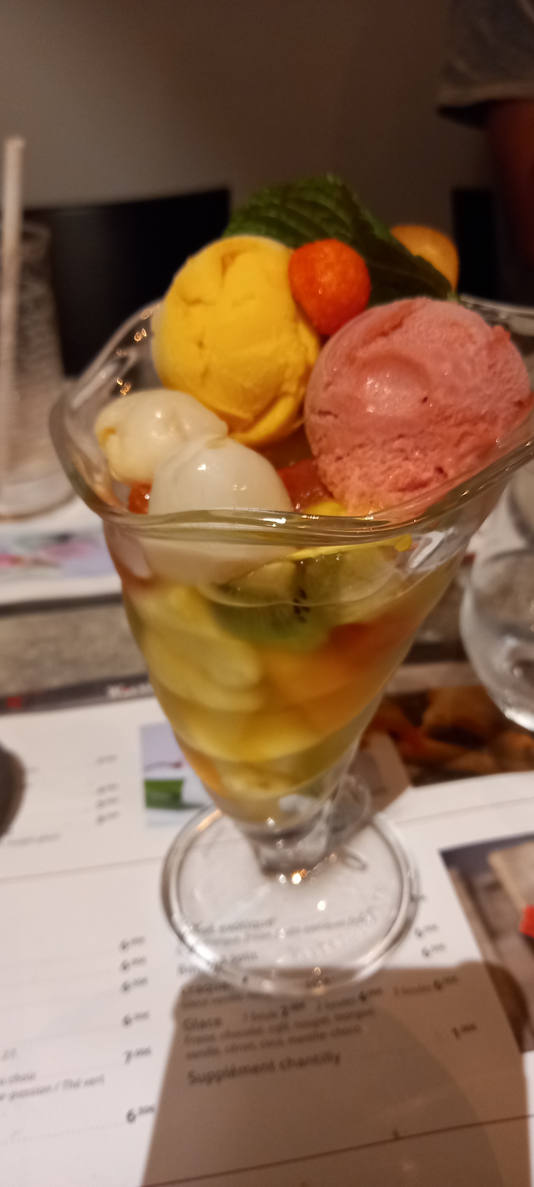 J'ai adoré la salade de fruits, très frais et goût varié, mais aussi les sushi, maki etc... C'est rare de voir des fruits en dessert merci 😊.
