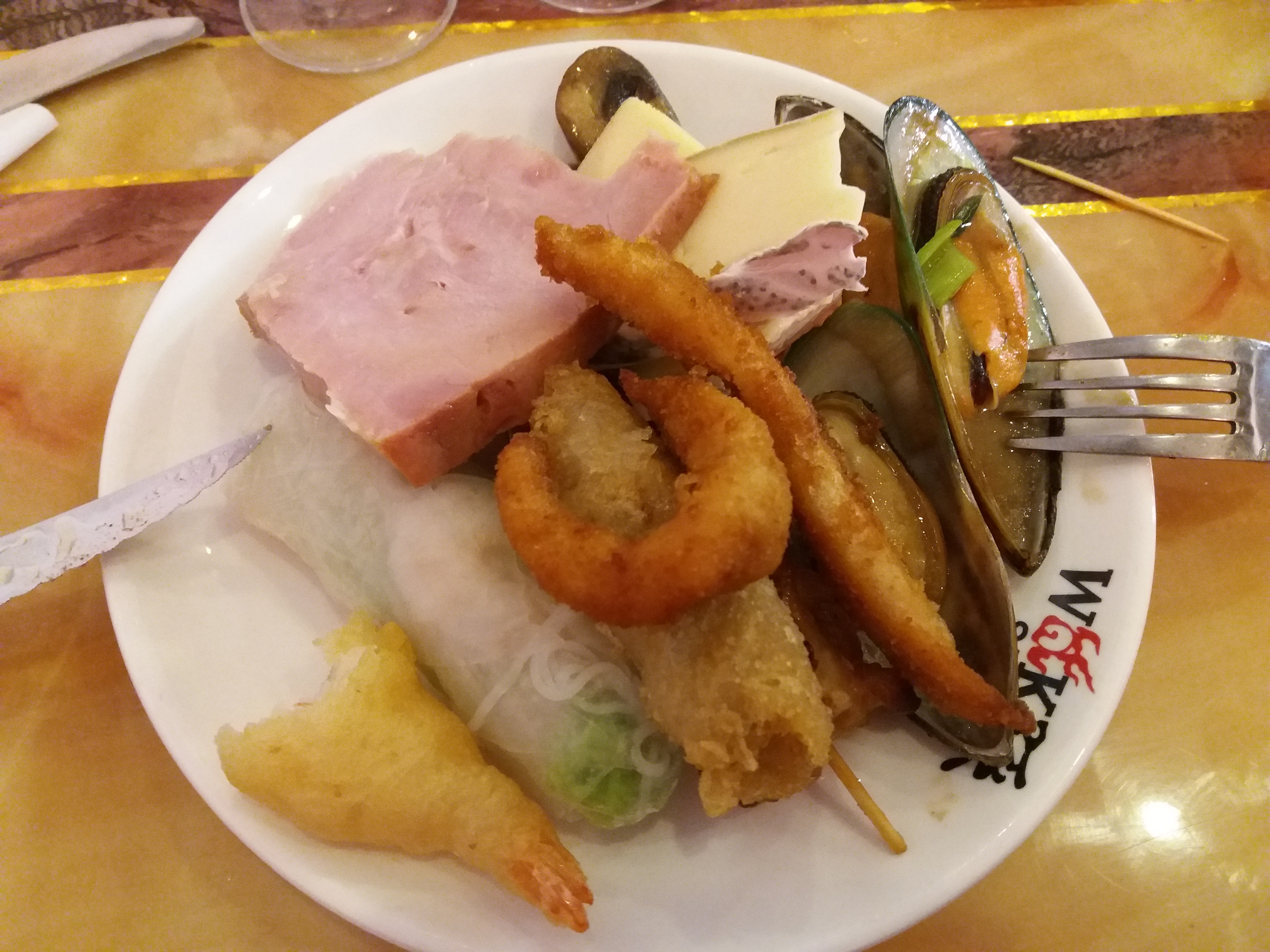 Produits douteux tel que les raviolis aux crevettes, le porc au caramel et une panna cotta au dessert que je préférerais ne pas consommer. Beaucoup de choix mais beaucoup de n'importe quoi aussi, des steaks hachés bas gamme décongelés pour le wok et des sushis qui avaient l'air appétissants et qui ce sont avérés être enrobés de toastinette 🤮 Je ne parle même pas du mélange viande/poisson à toutes les étapes. Mais qui sont ces gens qui mettent 5 étoiles ? 🤔