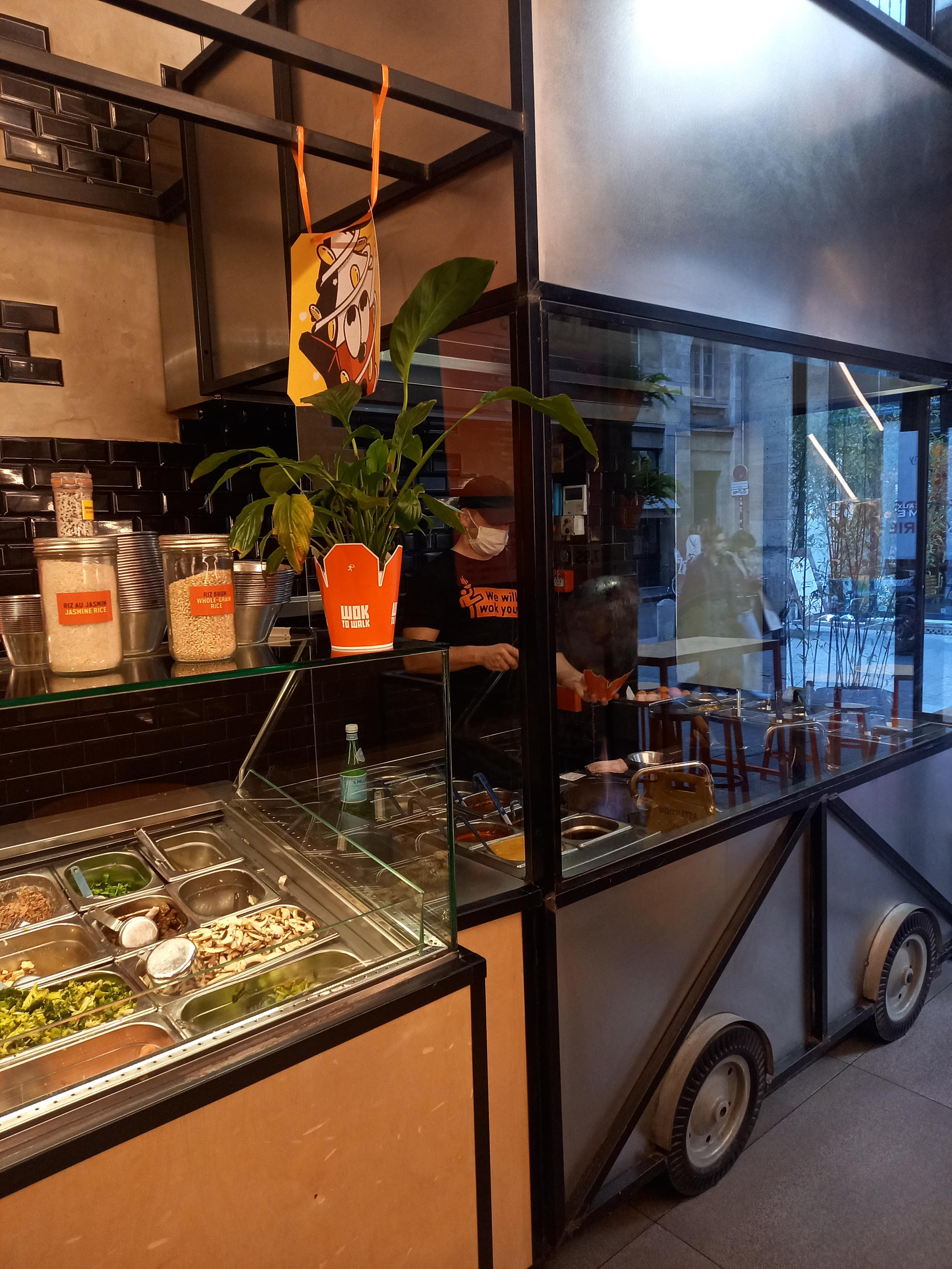 De l’extérieur ça donne pas mal, un effort sur la déco et un concept original. Malheureusement le plat à la carte à la façon subway ne fonctionne pas à cause du prix, du moins nous sommes attirés par le prix mais au final l’addition monte vite. Le plat était correct, en goût et en quantité, l’attente n’a pas été trop longue car début de service. L’offre conviendra très bien à ceux qui veulent un plat sur mesure « assemblé » sous leurs yeux.