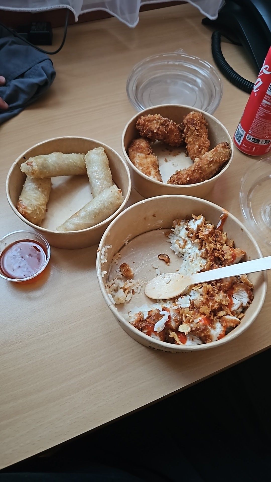 Commande sur Uber Eats avec ma compagne... Très bof. Poulet crousty avec sa sauce omniprésente et grasse grasse grasse. Je ne suis pas compliqué, je mange de tout mais là je n'ai pas fini mon plat, c'était vraiment pas fou-fou. Je ne sais pas ce qu'on va faire des restes demain. On note la gentillesse de la dame qu'on a eu au téléphone pour rectifier la sauce, mais ça ne sauvera pas la médiocrité du plat qu'on a mangé ce soir