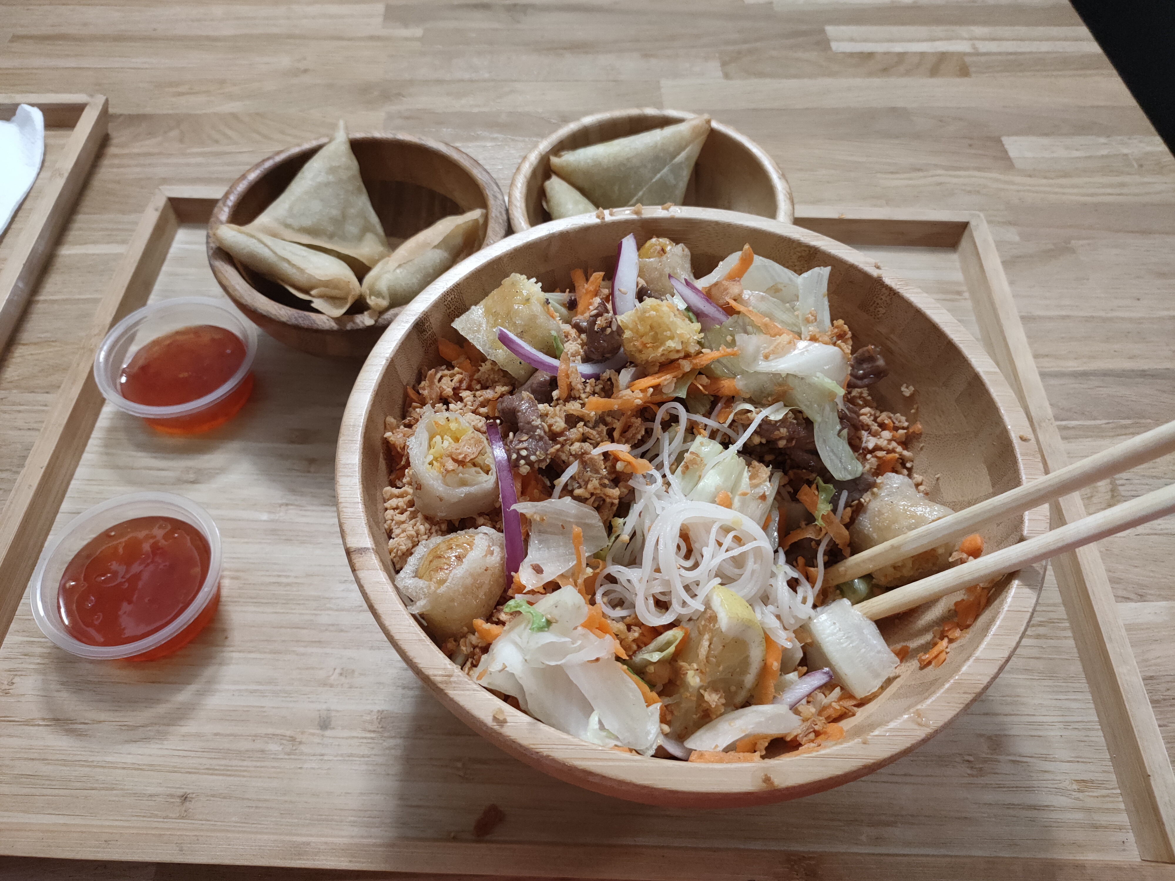 Commandé sur Uber Eats Certes les plats sont arrivés chauds et copieux Mais, le bobun était trop sec et fade Les 2 Poulet Crousty XL sont certes copieux mais beaucoup trop gras, plein de crèmes type fast food ++++, difficile de finir le plat car trop écœurant On ne recommande pas