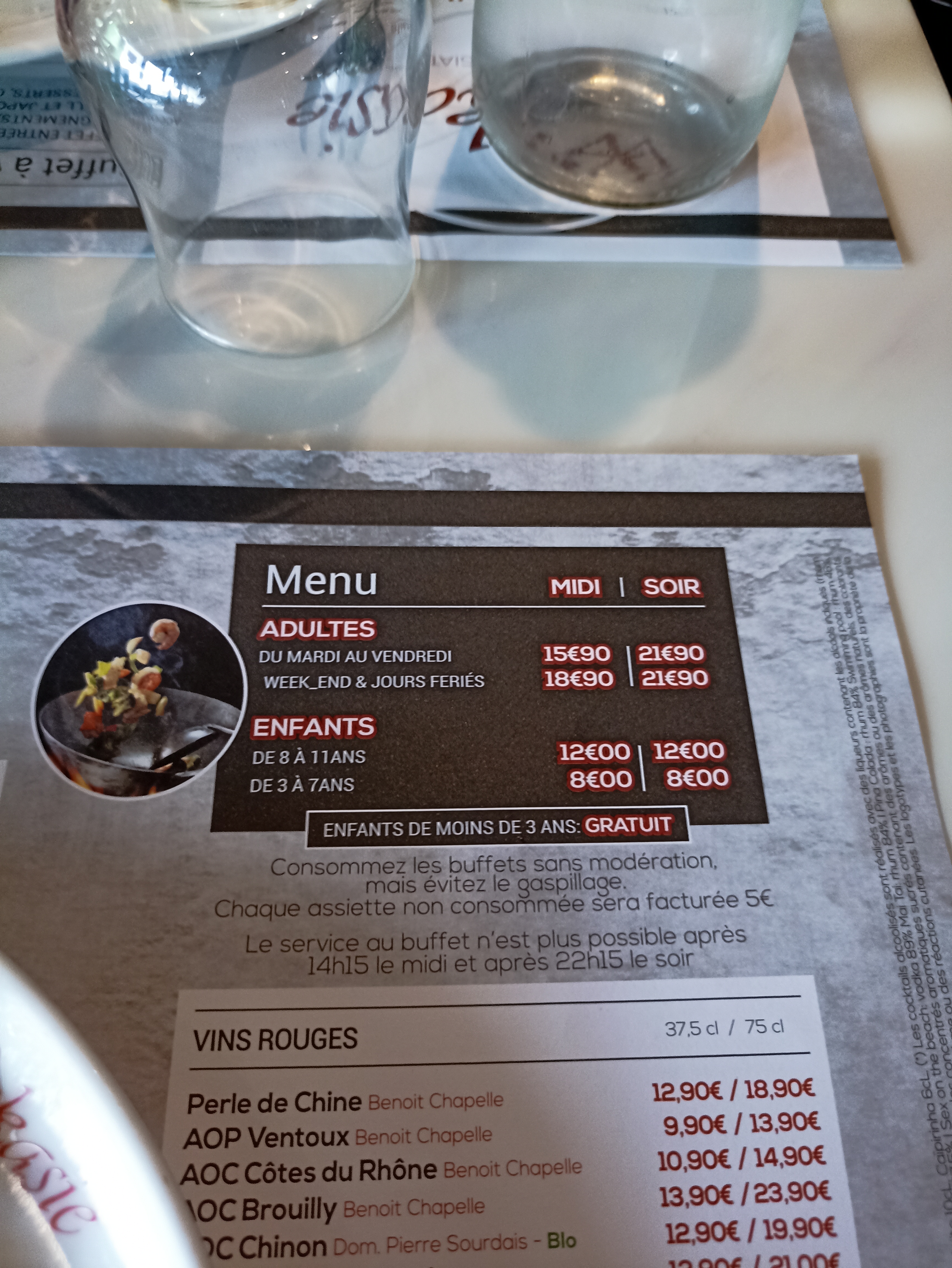 Pas chère. Restaurant propre et serveuses et serveurs toujours disponibles alors que le buffet est à volonté. Vraiment Très bien agréable pour des repas en famille ou amis ou autre.. 👍😊