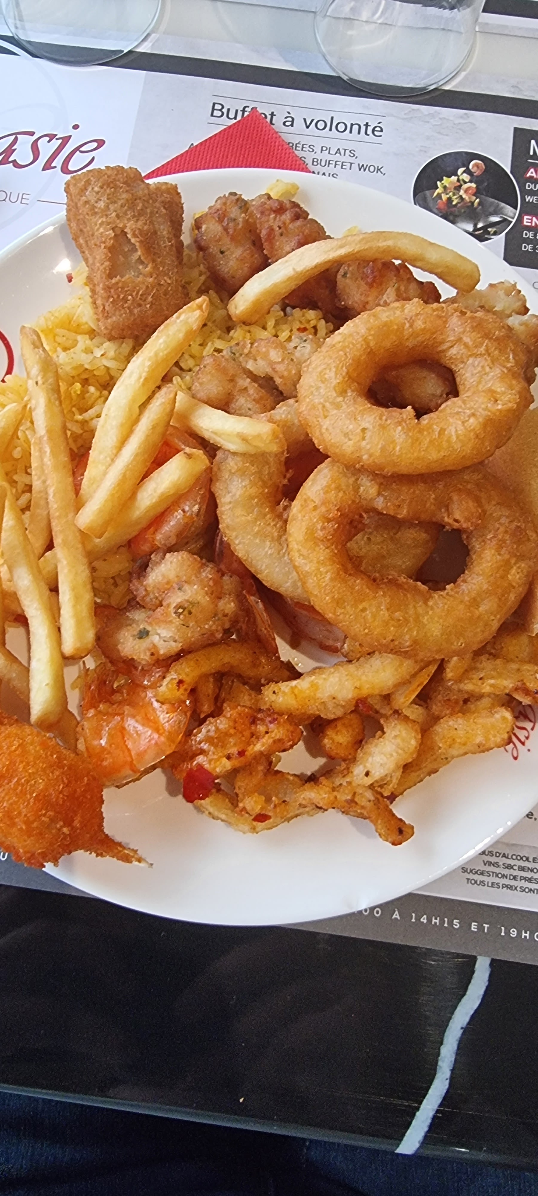 Beaucoup de choix de plat mais de qualite moyenne surtout les entrées frits beaucoup trop cuites. Les cuisiniers au wok / grille plutôt gentil mais hygiène plutôt moyenne surtout au niveau du wok Une serveuse nous place mais personne ne vien prendre la commande de boissons il a fallut allé réclame à la caisse et une personne est venu après 5 bonnes minutes La salles n est pas propre du tout Résultat l addition est trop élevé pour la qualité propose dommage qu' il y est une telle perte de vitesse pour un restaurant qui était plutôt correcte avant...