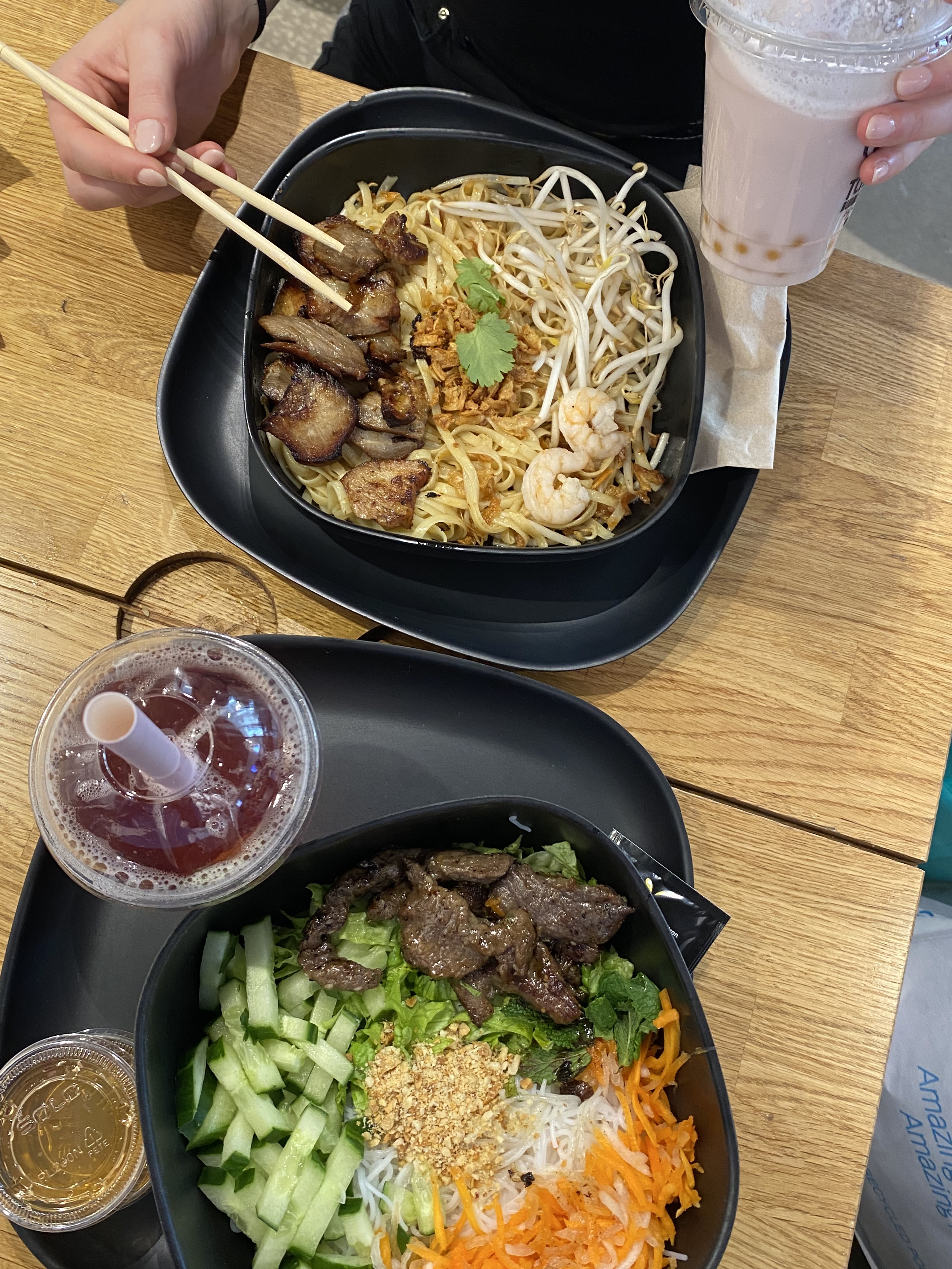 Cliente habituelle, j'adore commander et manger sur place. Impressionant la rapidité du service et la qualité des plats (surtout le pad thaï, un peu moins la soupe phô). Quantité normal, ça nous cale bien. Les bubbles tea sont super bon!!!!!!!