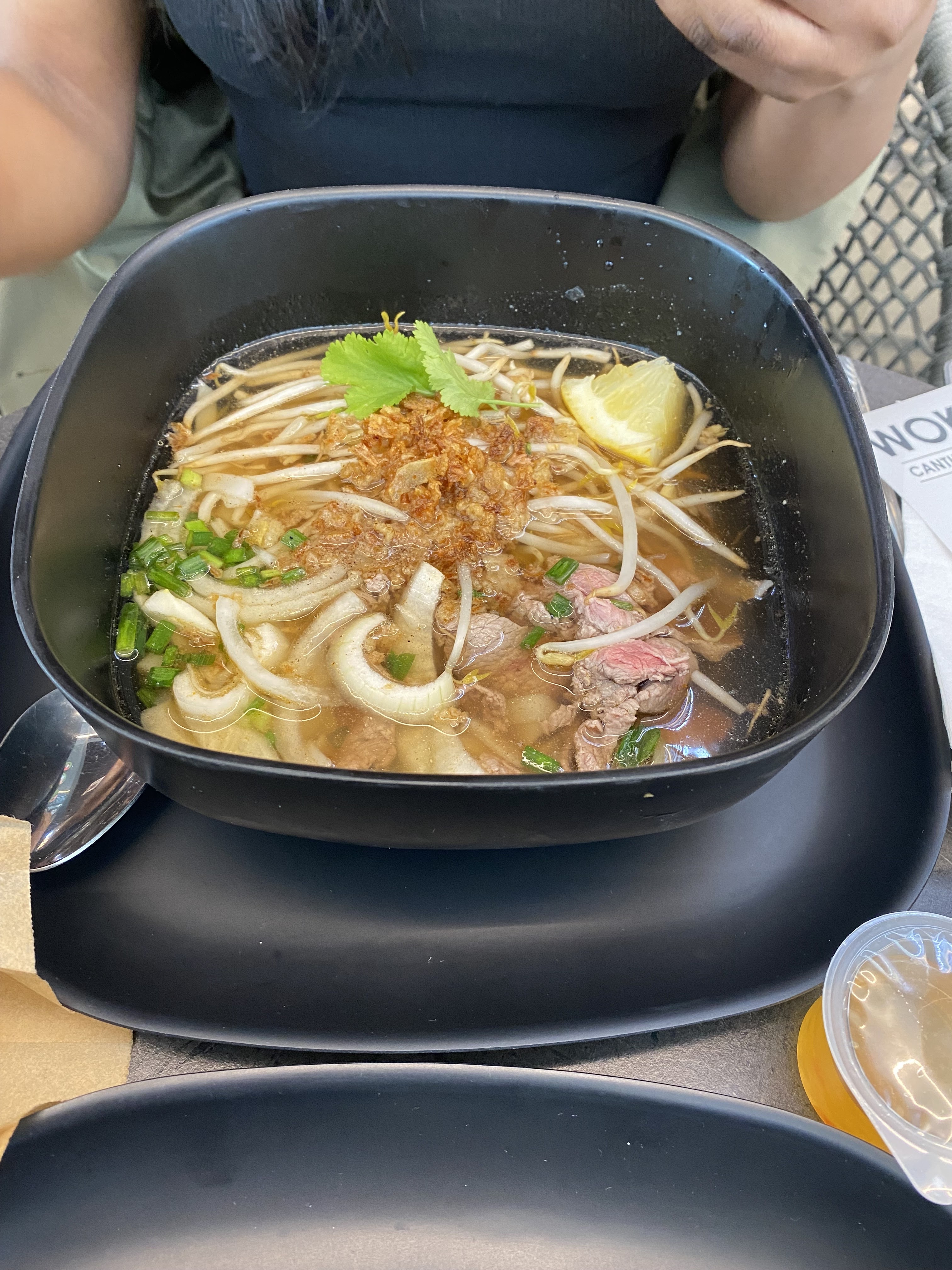 Prise de commande rapide, on nous dépose bip, couverts et tickets dans une assiette, niveau sanitaire pas fou, ok on doit limiter les contacts mais déposer ce type de chose dans une assiette. Les pots de gel hydroalcoolique ne sont pas pratique. Les tables collent, pas l'impression que ce soit entretenu. On est servi rapidement, 2 pho et 1 bo bun (j'ai pris un pho). Je déconseille si vous êtes amateurs de nourriture. Je m'attendais à ce que ce soit poivré au vue de l'apparence mais il semblerait que seul 1 des 2 pho ait été assaisonné 2 doses ou bien plus vu que c'était immangeable. Les pâtes de riz sont trop dures malheureusement. Le plat possède 2 types d'oignon. Oignon frais, ok. Oignon frit, pourquoi ? Le boeuf était trop cuit et sans goût. Heureusement il y a les herbes mais malheureusement, le citron et même le piment ne permet pas d'améliorer le goût imbuvable de cette soupe beaucoup trop poivré. 3 bouches pour attester. Bouillon pas du tout semblable à un pho, rappelle plus un autre plat. À ne pas qualifier de pho. Respectueusement, Un vietnamien. PS: Petit bémol sur le bo bun, deception de mon ami car il n'y avait pas de nem. Restaurant proposant. Ah non à la carte uniquement, des bb tea qui ne sont pas disponibles.