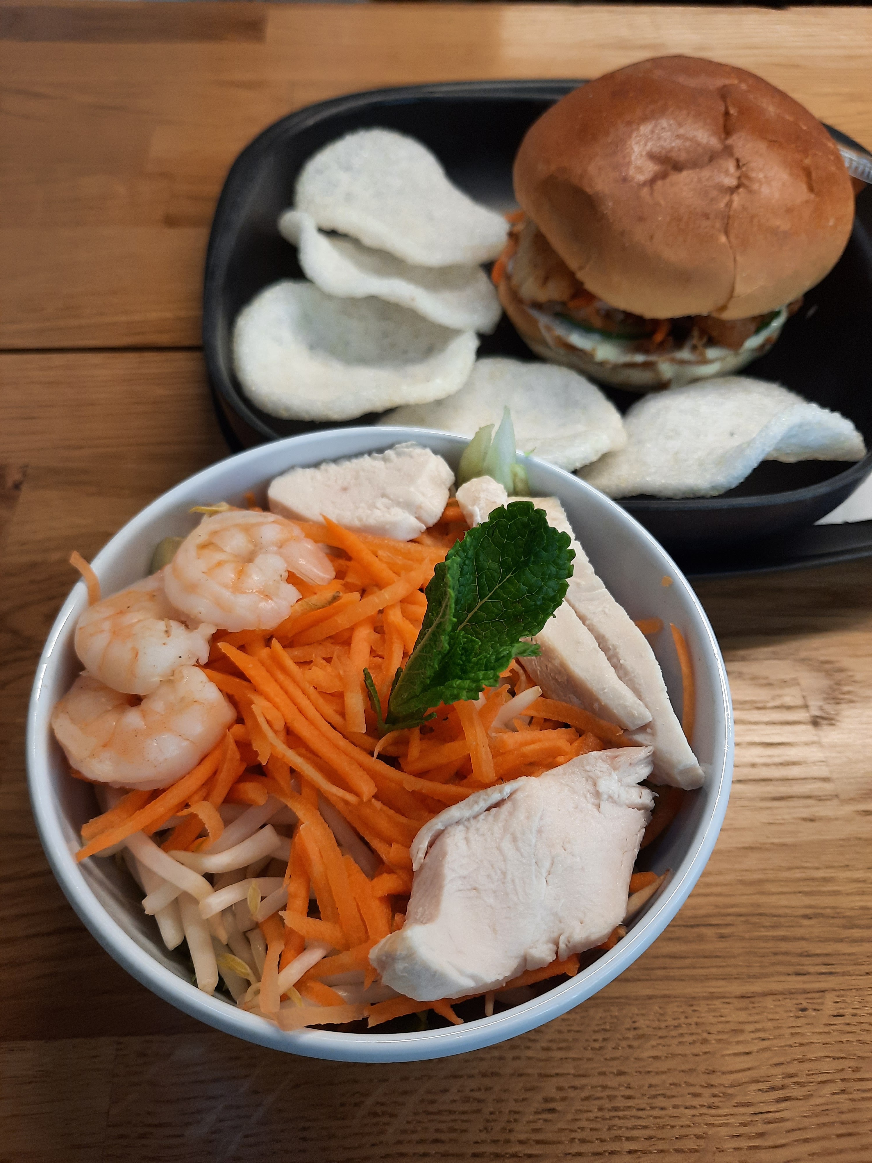 J'ai pris le burger vietnamien accompagné de chips de crevette et honnêtement je suis un peu déçu Je pensais qu'il serait accompagné par bien plus de chips, c'est dommage. Le burger en lui même était bon (je l'ai pris avec du porc laqué) mais il y avait bien trop de sauce, on ne sentais même plus le goût du porc tellement elle prenait le dessus. J'ai aussi pris un bubble tea pumpkin spice et bon... mwai sans plus quoi c'est sympa mais c'est pas incroyable. Le plateau qu'on m'a donné n'avait pas l'air très propre et les tables ne sont pas du tout nettoyé malheureusement