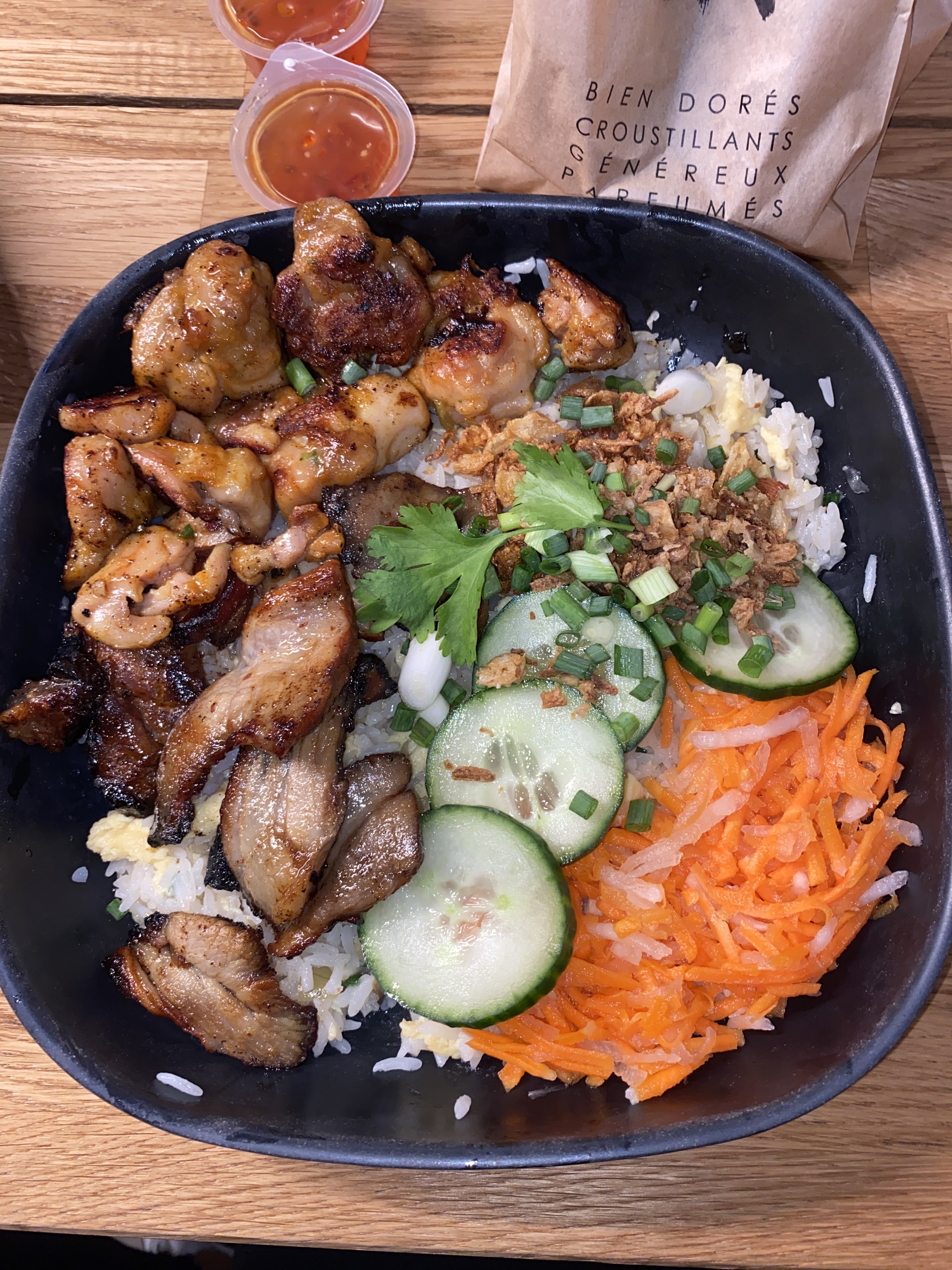 Je ne sais pas c’est quel fournisseur de poulet mais pour le prix du bo bun vous appelez ça du poulet ? Avec la texture de crevette. C’est juste degueulasse bobun sans cacahuète 3 oignons frit, QUEL DÉCEPTION