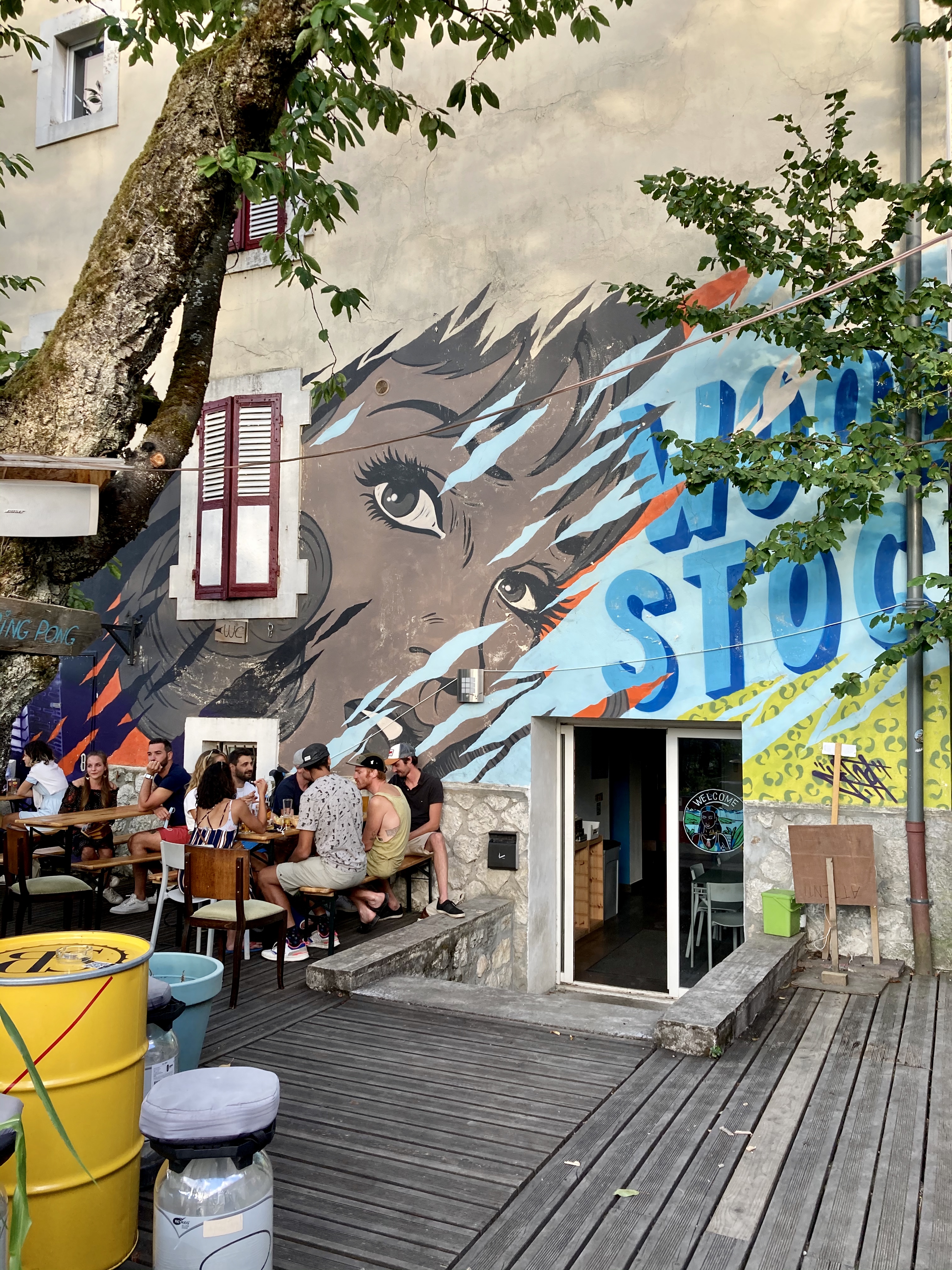 L'endroit n'est pas forcément simple a trouver. De l'extérieur on ne voit presque pas le woodstock bar. Une fois entré on ce retrouve sur un jardin avec pleins de table et assise en palette. L'endroit est super agréable et détendu. La nourriture et les boissons sont bonnes. Après pour les prix, ils sont adaptées au prix d'Annecy.