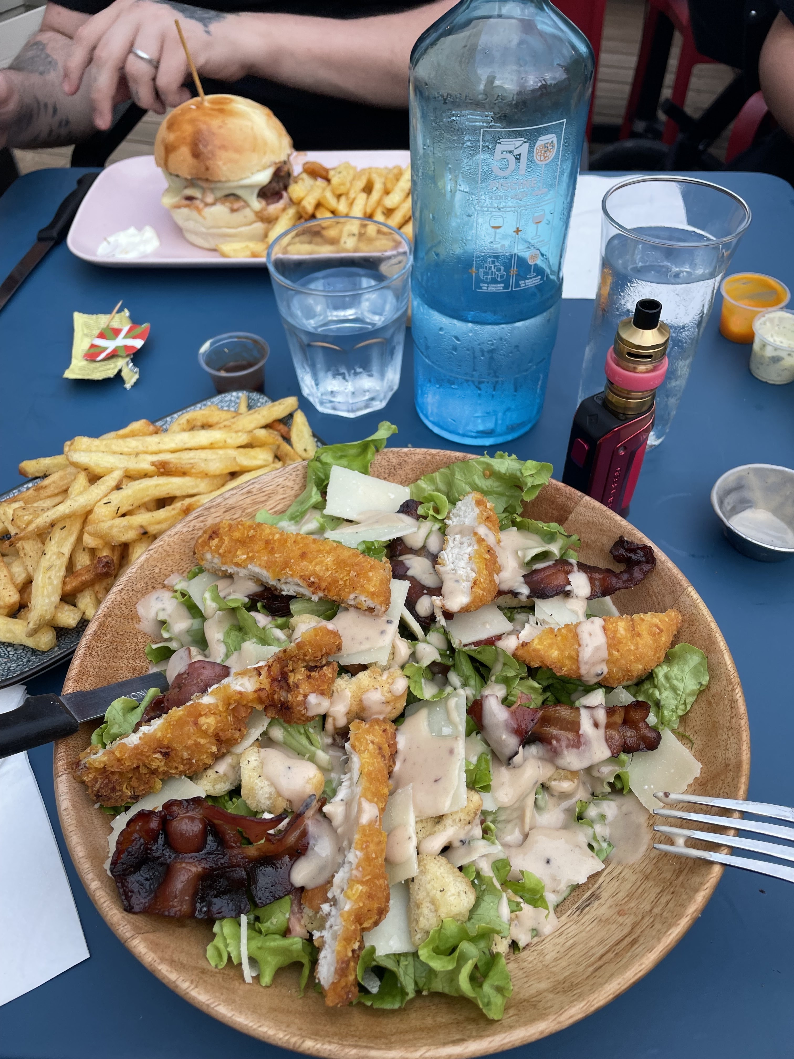 Un fantastique petit trésor caché qu'il vous faut absolument visiter si vous êtes proche d'Anglet / Biarritz. L'équipage est extrêmement sympathique, on se croirait dans une grande entreprise familiale heureuse. Pour couronner le tout, ils servent certains des meilleurs hamburgers que j'ai jamais mangés de mon temps. La viande de burger légèrement moyenne comme un bon steak, combinée avec du bacon français et du fromage, tous deux pleins de saveur, donne une expérience de burger complète et épanouissante. De plus, le restaurant propose de l'eau gratuitement, il est donc convivial pour tous les HydroHomies ! J'aimerais pouvoir donner une sixième étoile à cette entreprise, car non seulement leur repas principal, mais aussi leurs plats de glaces étaient fantastiques. Une recommandation définitive !