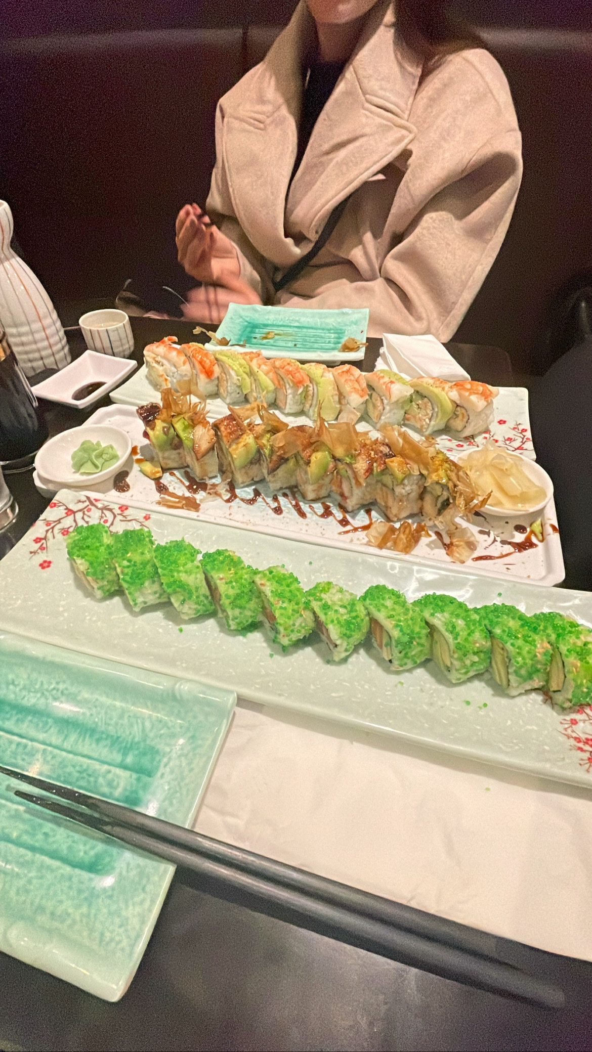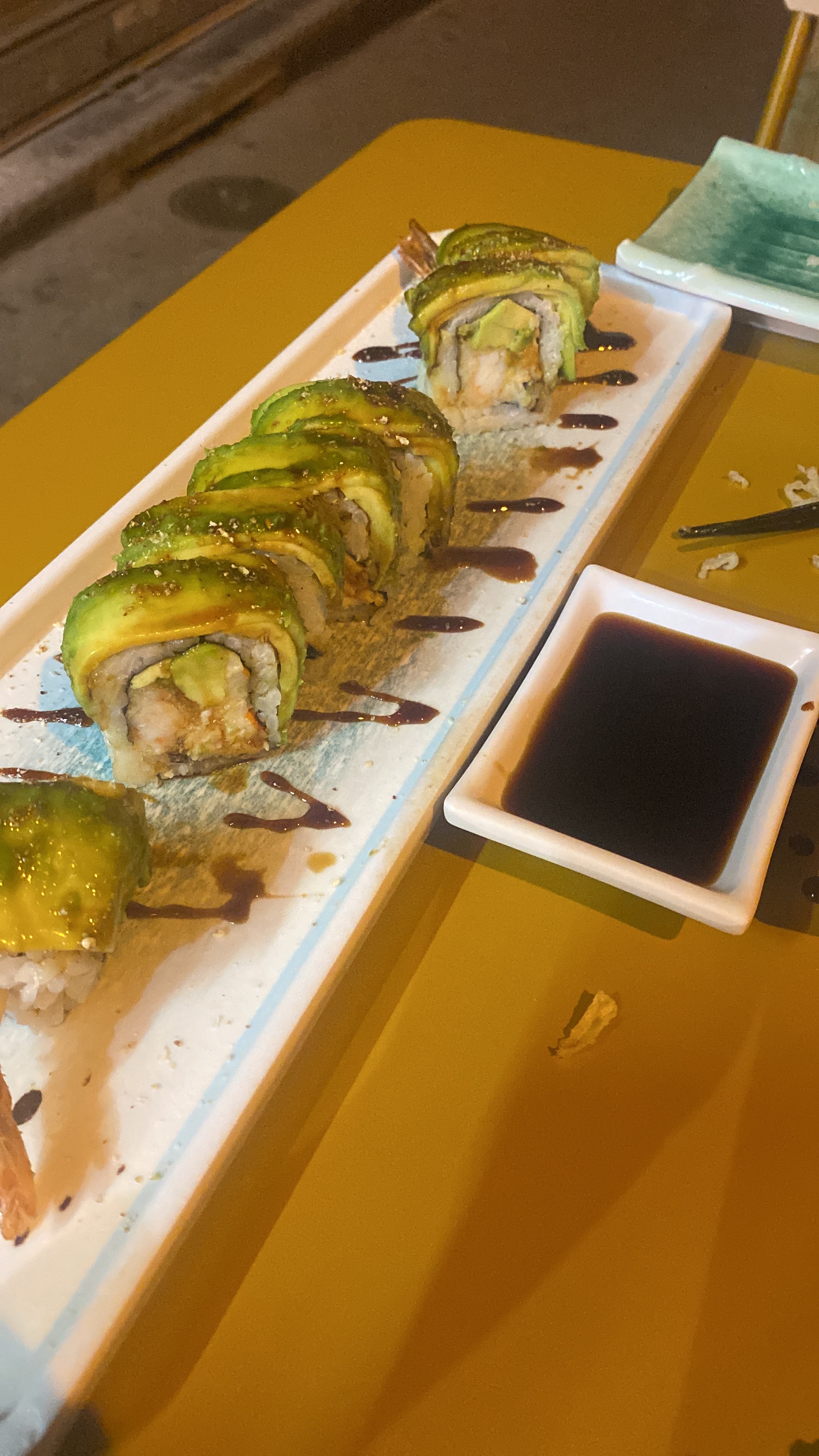 Les Californias étaient bien et frais mais je suis déçue de leur plat teriyaki boeuf qui n'était pas un vrai teriyaki et n'était pas bon non plus .autres déceptions :les gyozas étaient frits alors que ce n'est pas mentionné sur la carte et ils ne proposent pas de brochettes ce qui est bien dommage . Autrement personnel gentil