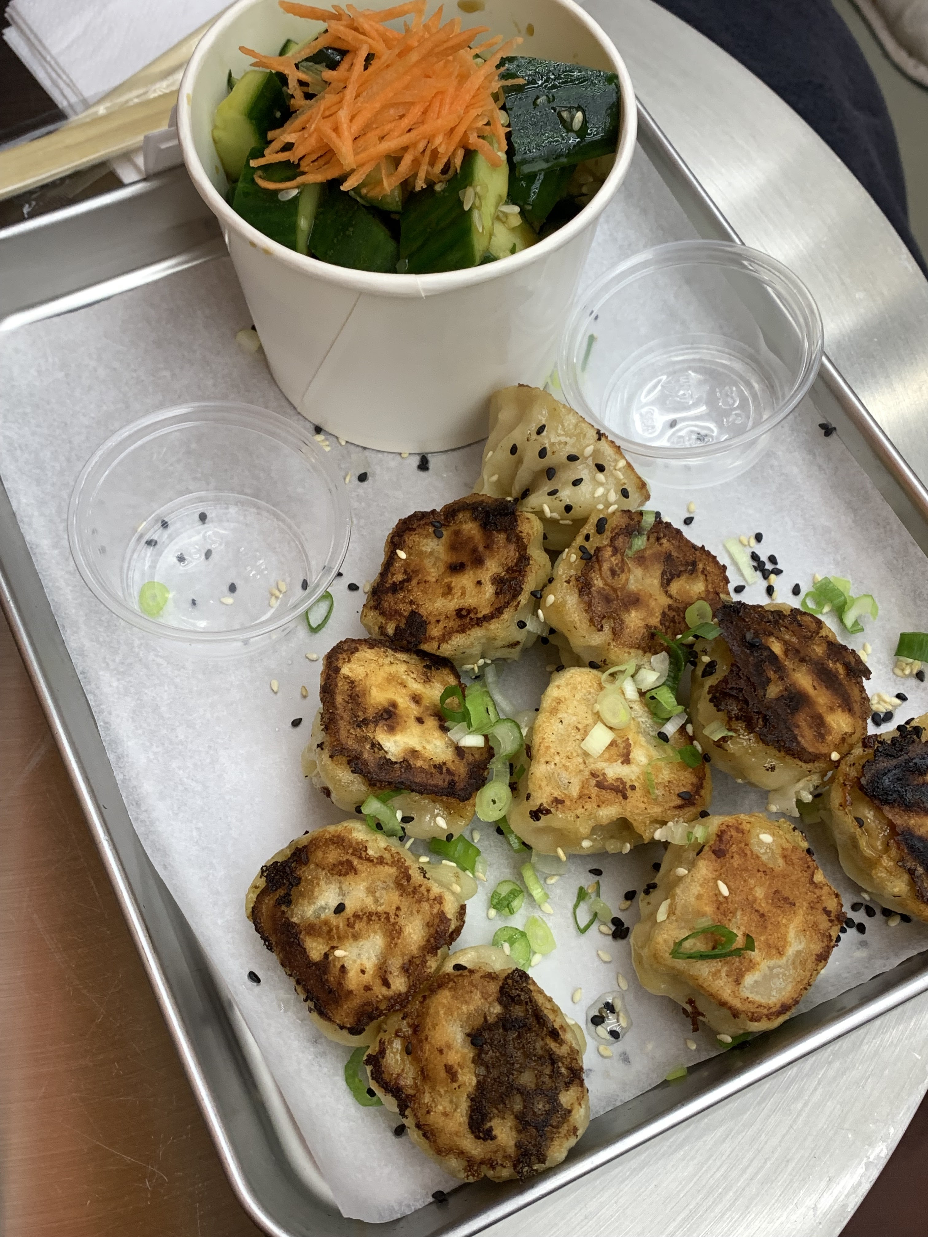 Nous y avons picoré des gyozas grillées. Tout est fait maison dans la mesure du possible. Le personnel est agréable. Les lieux pourraient être un peu plus travaillés probablement mais l'ambiance street food/good truck est intéressante. C'est plutôt bon marché. J'y retournerai pour goûter au reste de la carte.