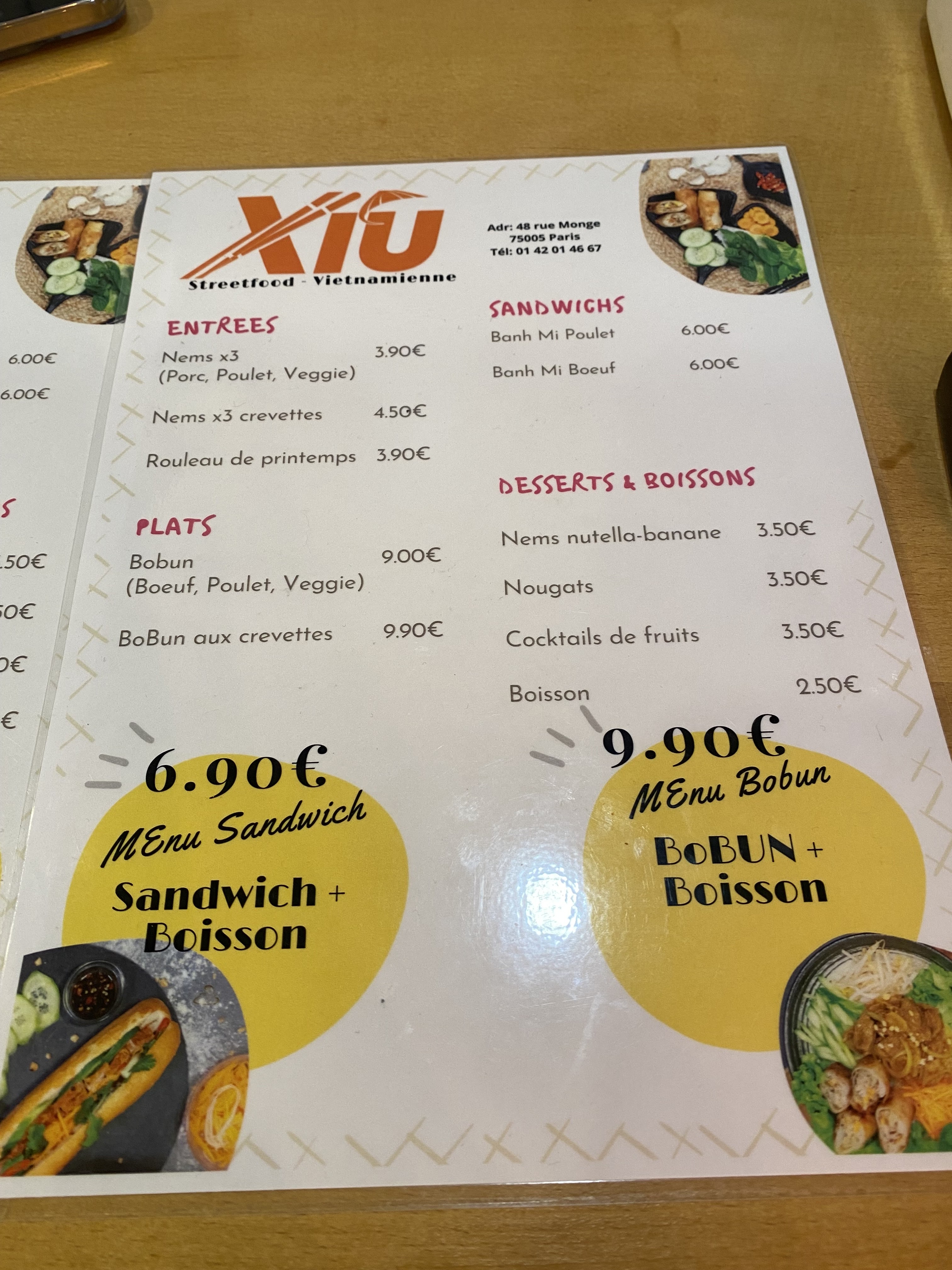Voici toutes les informations sur le Restaurant vietnamien XIU - Việt Street-food qui ce trouve au 48 Rue Monge, 75005 Paris (75). Sur cette fiche vous trouverez les photos, l'adresse, les horaires d'ouverture, le numero de téléphone et les avis clients.Vous pouvez églement rédiger un avis si vous le souhaitez en bas de page.