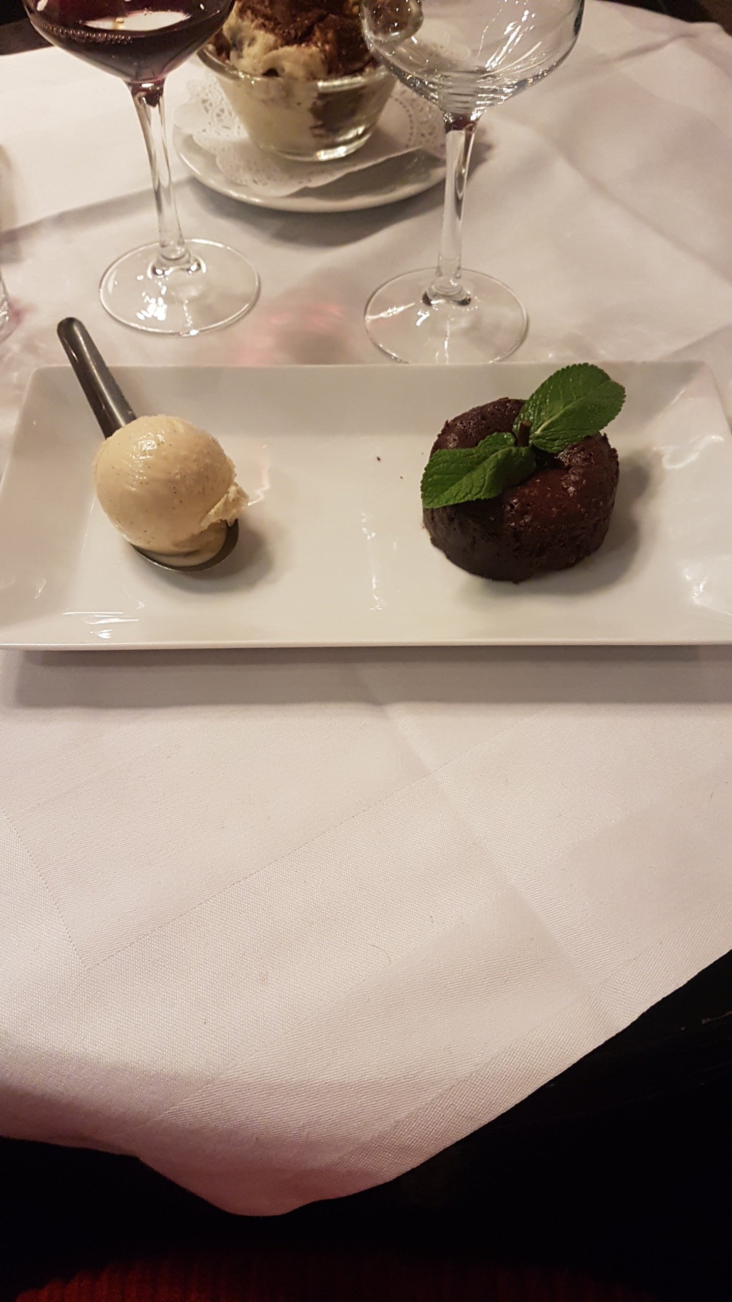 Assis dehors pour le dîner. J'ai commencé avec un bon vin rouge, puis j'ai décidé de rester pour manger. Commencé avec des Escargots qui étaient délicieux. Mon plat principal était le Bouef Bourguignon qui était fantastique ! J'ai terminé avec la Crème Brûlée qui était parfaite. Le tout arrosé de vins français incroyables. L'ambiance était géniale et le service était excellent. Merci.