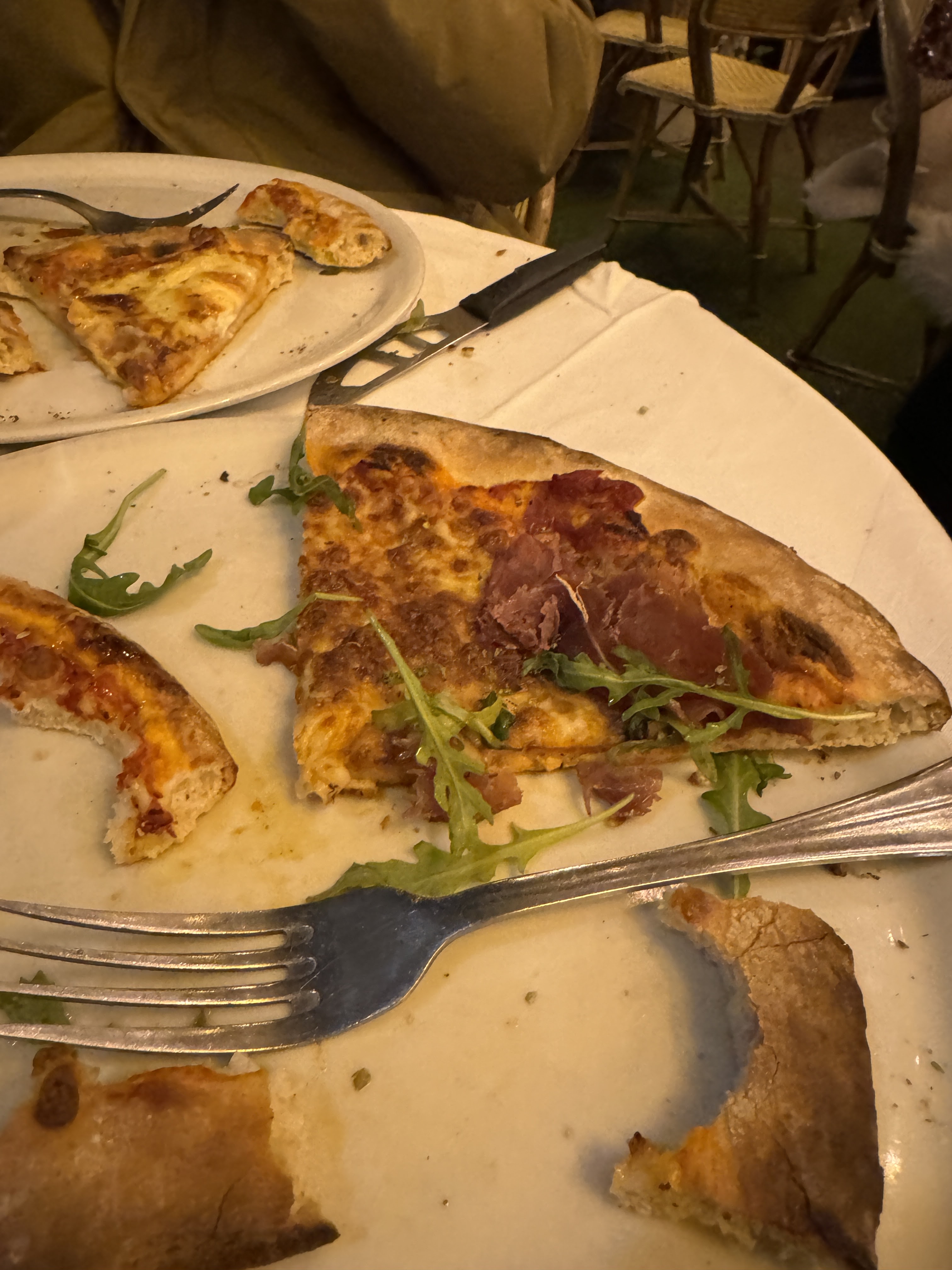 Si vous vous retrouvez ici, la pizza peut être copieuse et a meilleur goût lorsqu'elle est arrosée de l'huile épicée fournie, oh ! et le sel et le poivre extra fins. L'escargot allait bien et le rosé a fait mouche. Nous avons réduit nos pertes et sommes ensuite descendus dans la rue pour un bon hamburger à Baagaa.