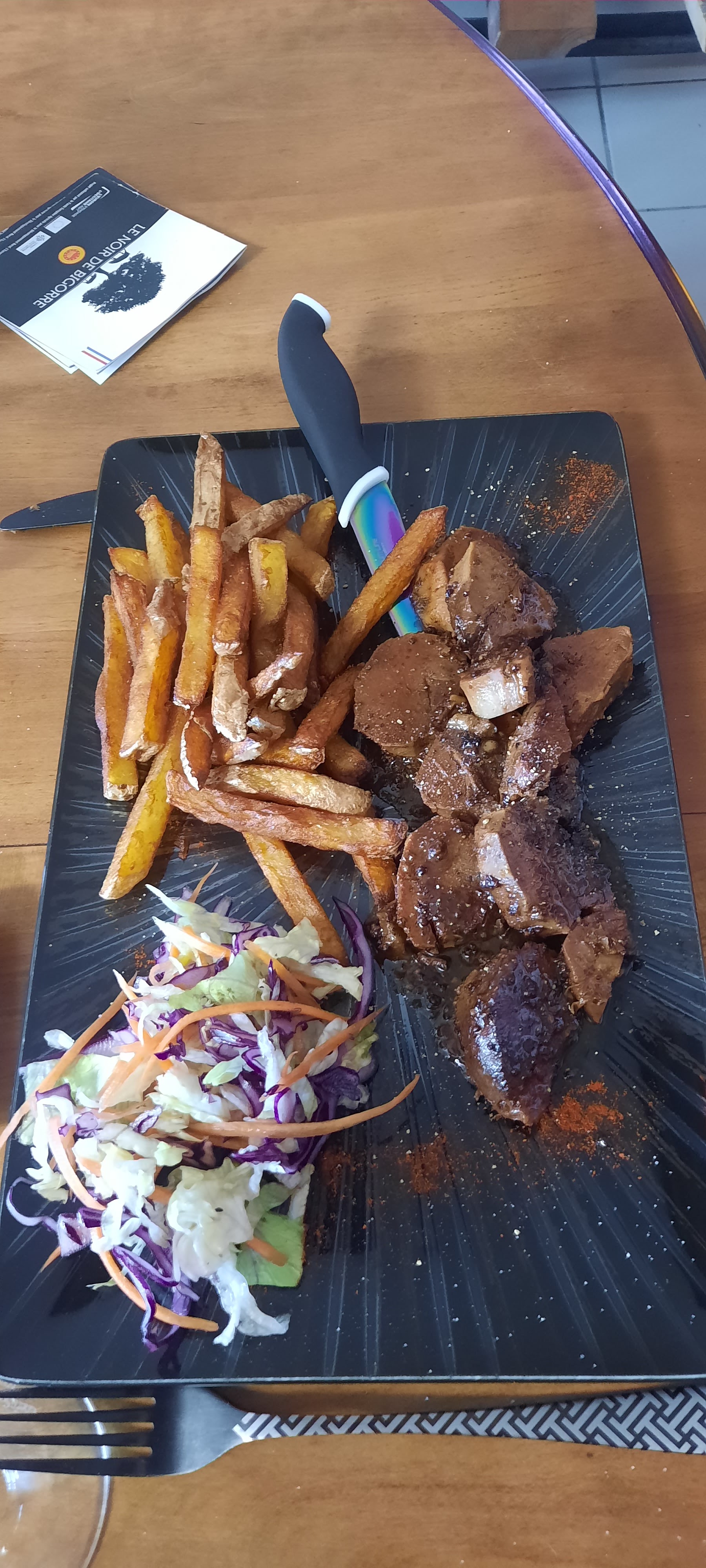 1ere fois aujourd'hui le 27 septembre 2022 suite à recommandation. Une fois la porte d'entrée franchie laissez vous séduire et surprendre par la décoration hétéroclite. Un propriétaire investi, intéressant, accueilant et qui ne nous en a pas voulu à mon mari d'avoir renversé son café et moi d'avoir cassé un vase 😂 quelle équipe !. Parlons maintenant de la cuisinière, propriétaire également, personne agréable, souriante, disponible, nous nous sommes régalés et le porc noir une tuerie Je mets en photos la planche charcuterie que nous avons partagé avec l'apéro, le plat carbonade et malheureusement en dessert une panna cotta caramel beurre salé mais je l'ai mangé avant de faire la photo. Bref ... on reviendra !
